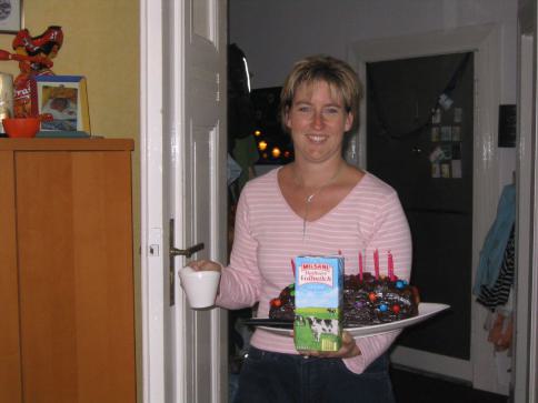 Mama brachte uns einen leckeren Kuchen mit Gummibärchen und Smarties. |