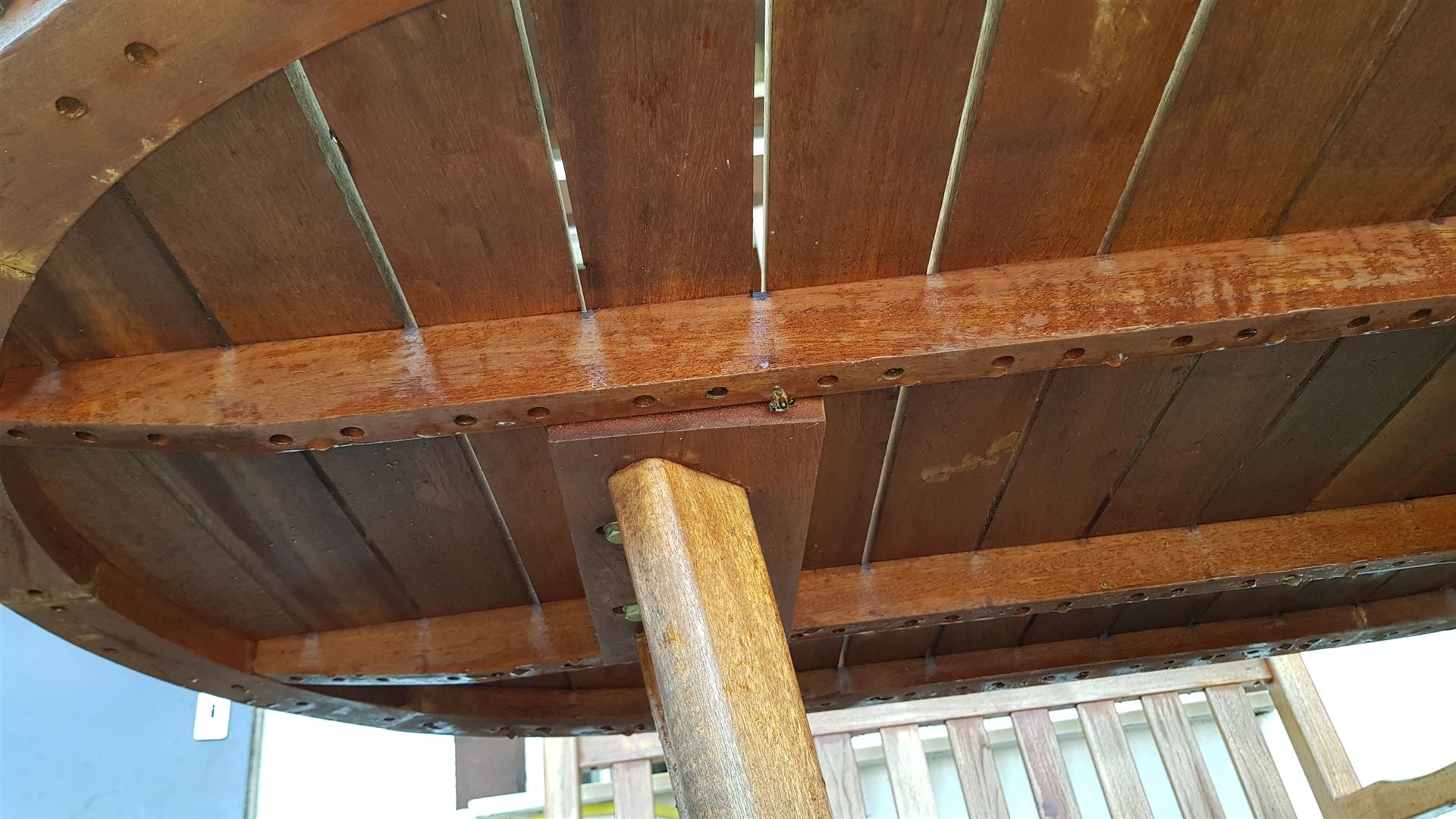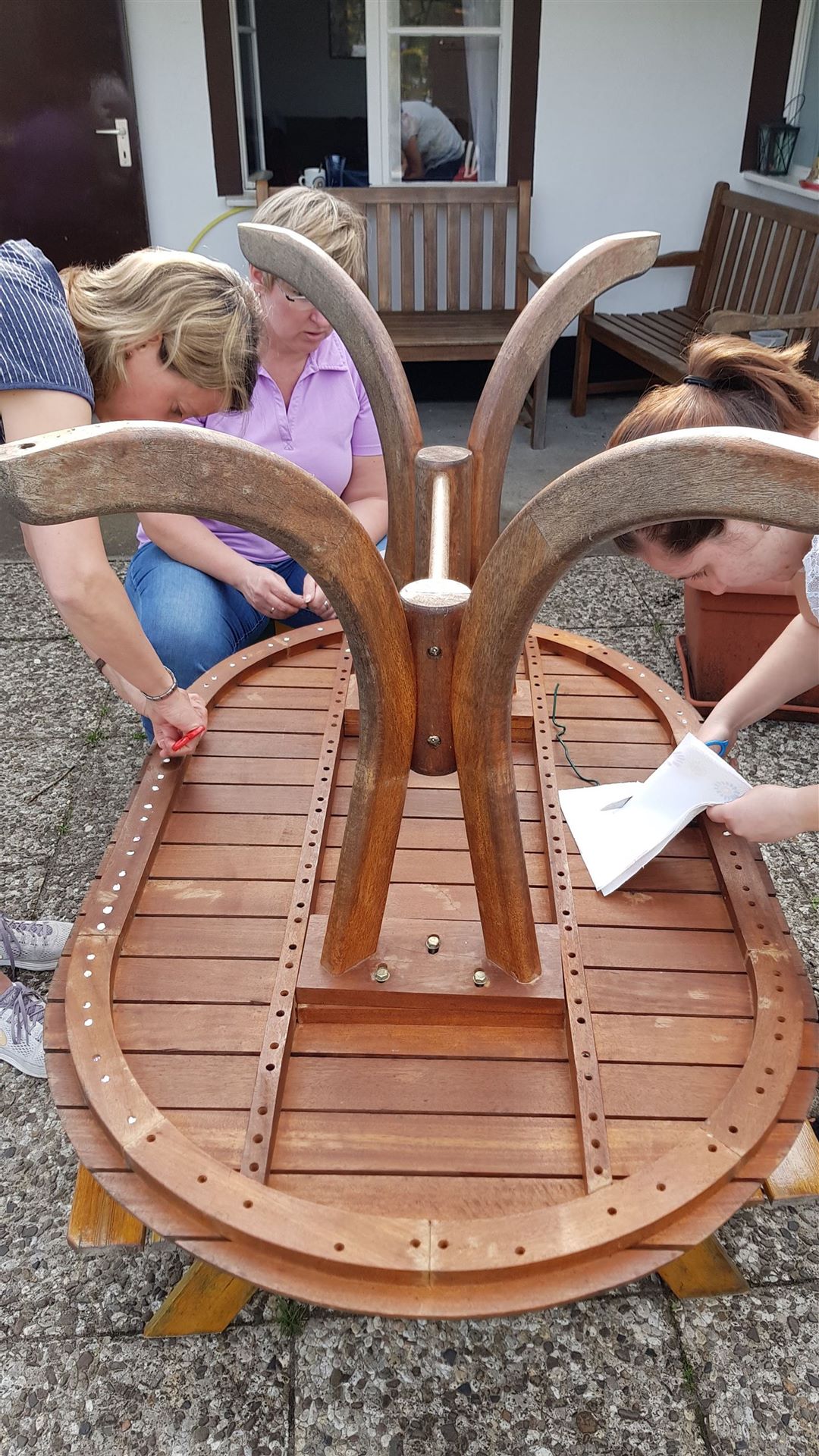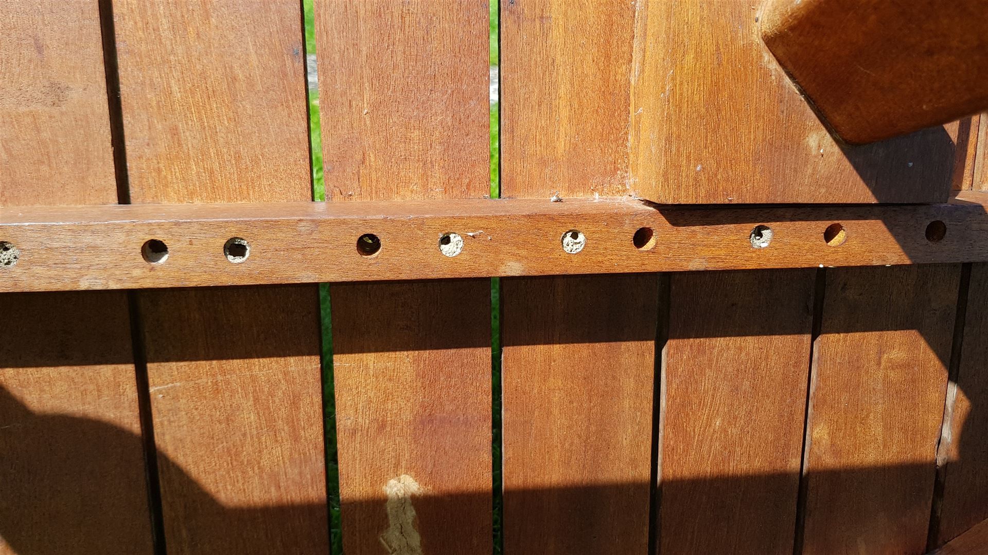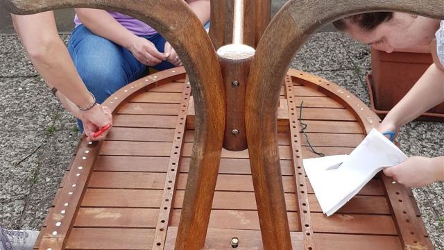 Bei genauerer Inspektion stellten wir fest, dass die Bienen sich in den Löchern unter dem Tisch und den Bänken eingenistet hatten.