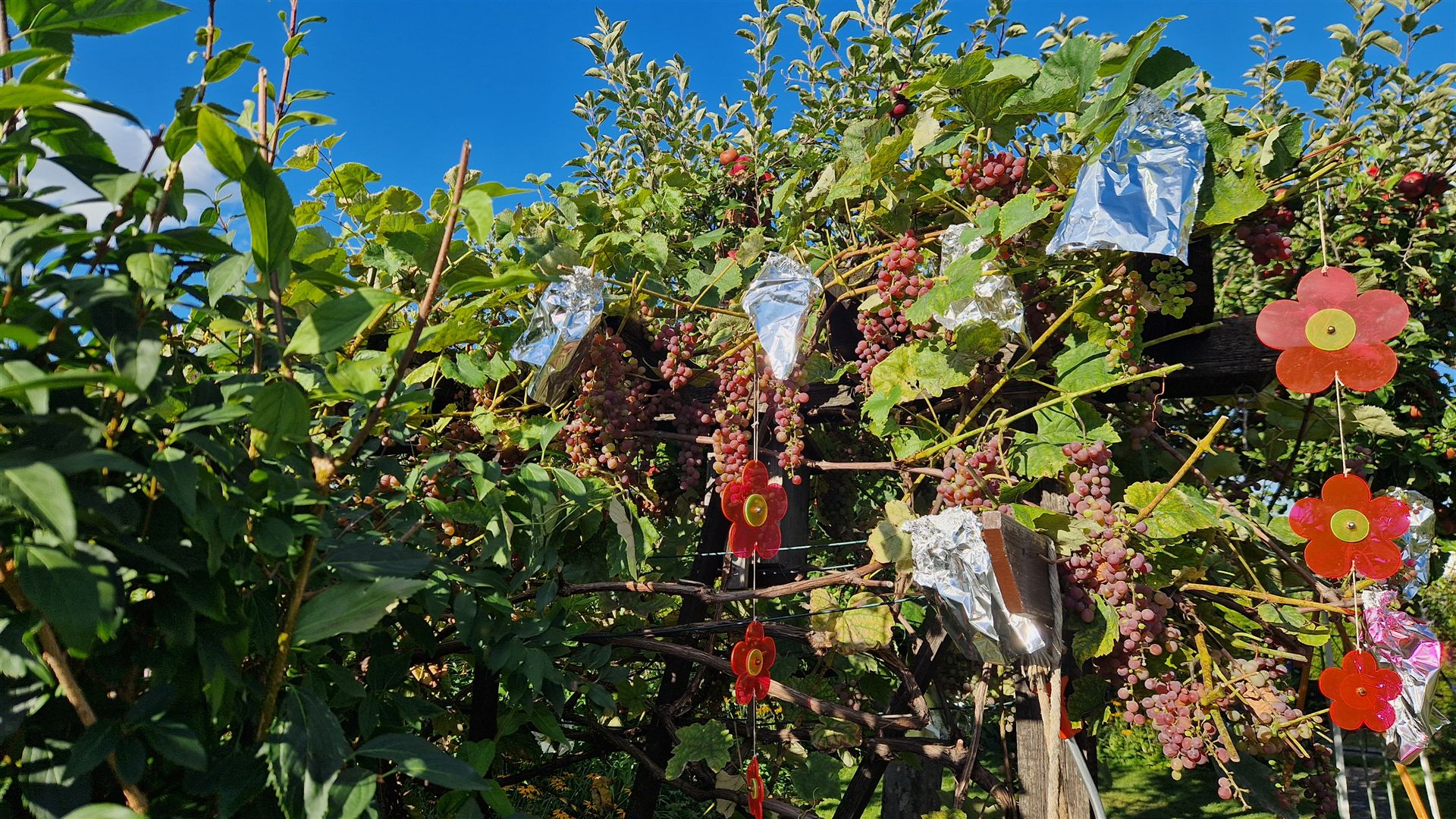 Die Trauben wurden langsam dunkler und wir lenkten die Vögel mit Alu-Folie ab, damit die Ernte nicht den diebischen Tieren zum Opfer fällt.