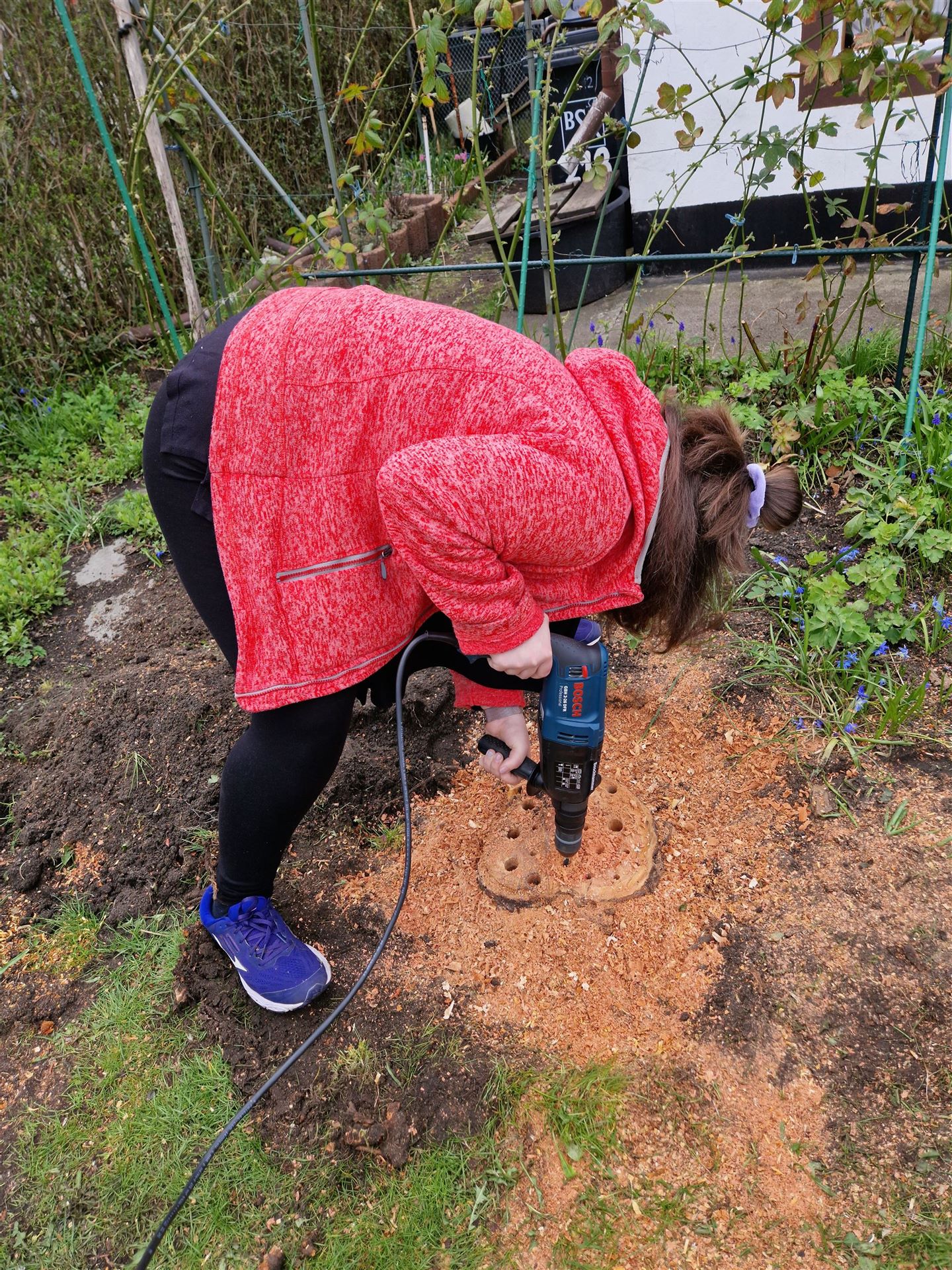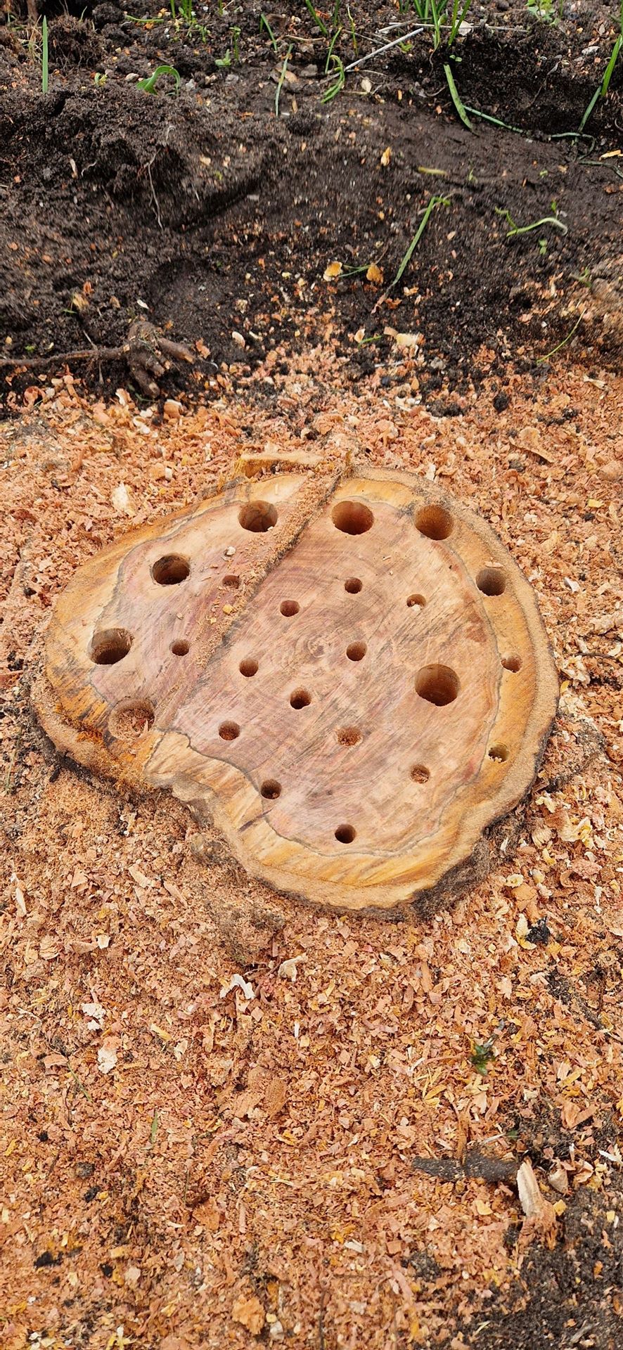 Nun wurde noch der Baumstumpf weiter gekürzt und anschließend durfte jeder mal Löcher in den verbliebenen Stumpf bohren.
