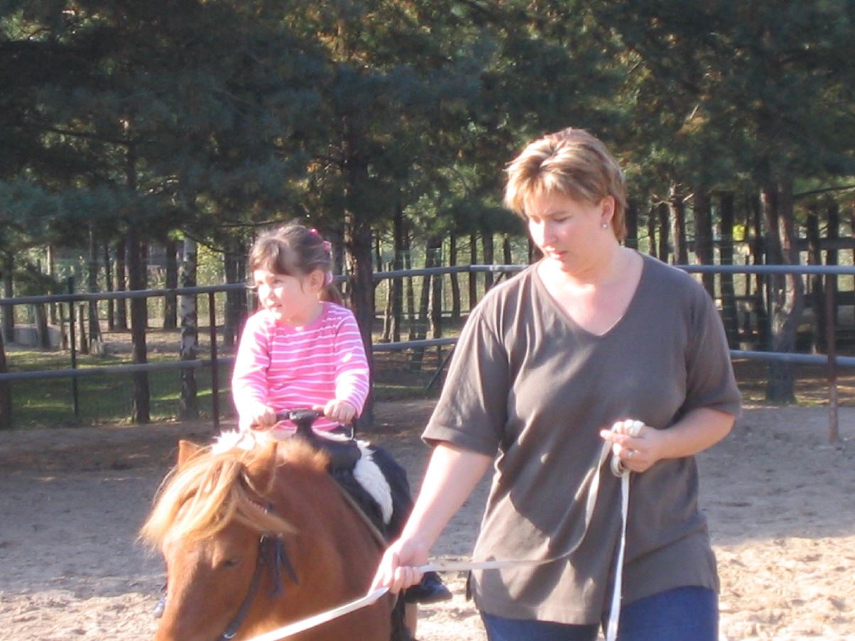 Im Freizeitpark gab es auch die Möglichkeit auf Ponys zu reiten und nachdem Lynn es vorgemacht hat, war auch Leonie bereit das erste mal den Rücken eines Pferdes zu besteigen. Claudia durfte Schnullerbacke und Leonie durch die Gegend führen. Scheinbar war das der Anfang einer Pferdeliebe, denn kurz darauf nutzte Leonie die nächste Chance zum reiten: Reiterhof am 30.10.2005 |