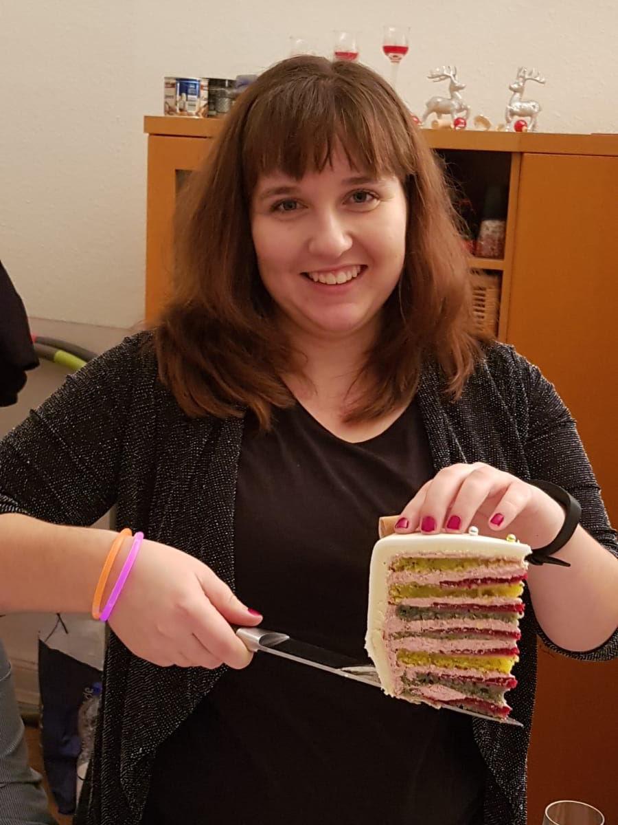 Leonie holte Ihre Torte, schnitt sie an und verteilte die Stücken.