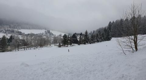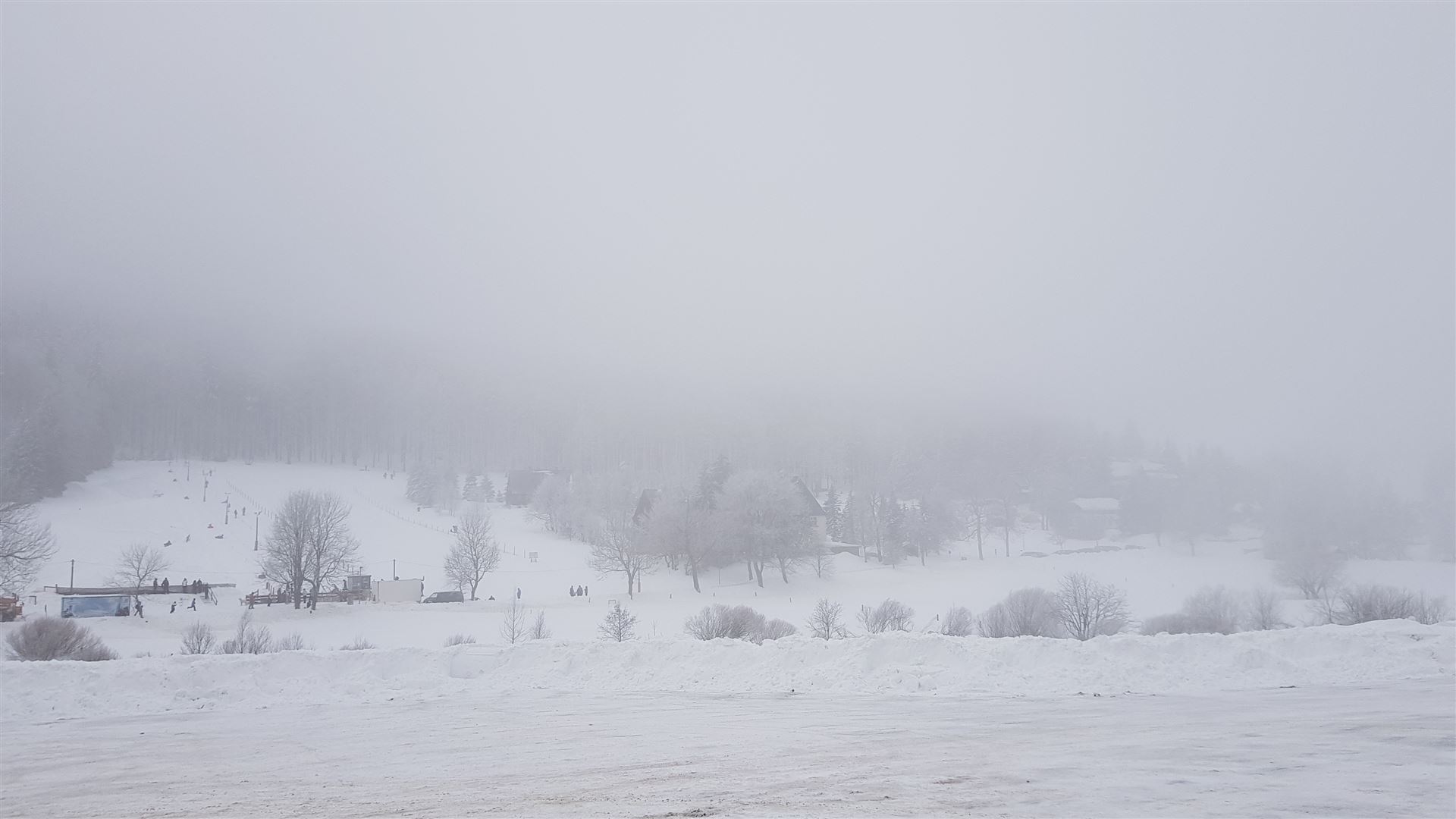 Und so kamen wir an unseren verschneiten Zielort an, der auch noch in Nebel eingehüllt war.