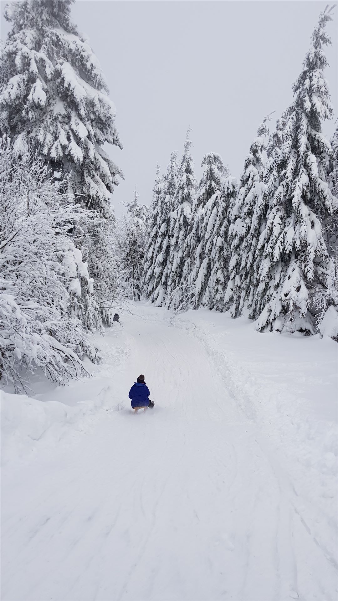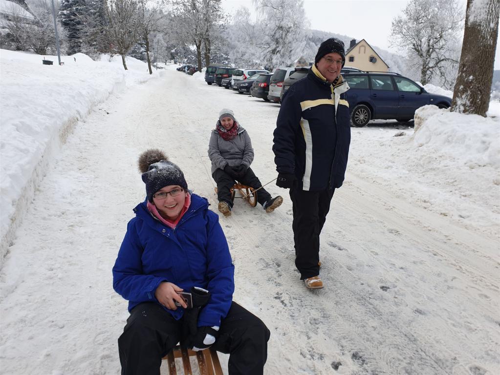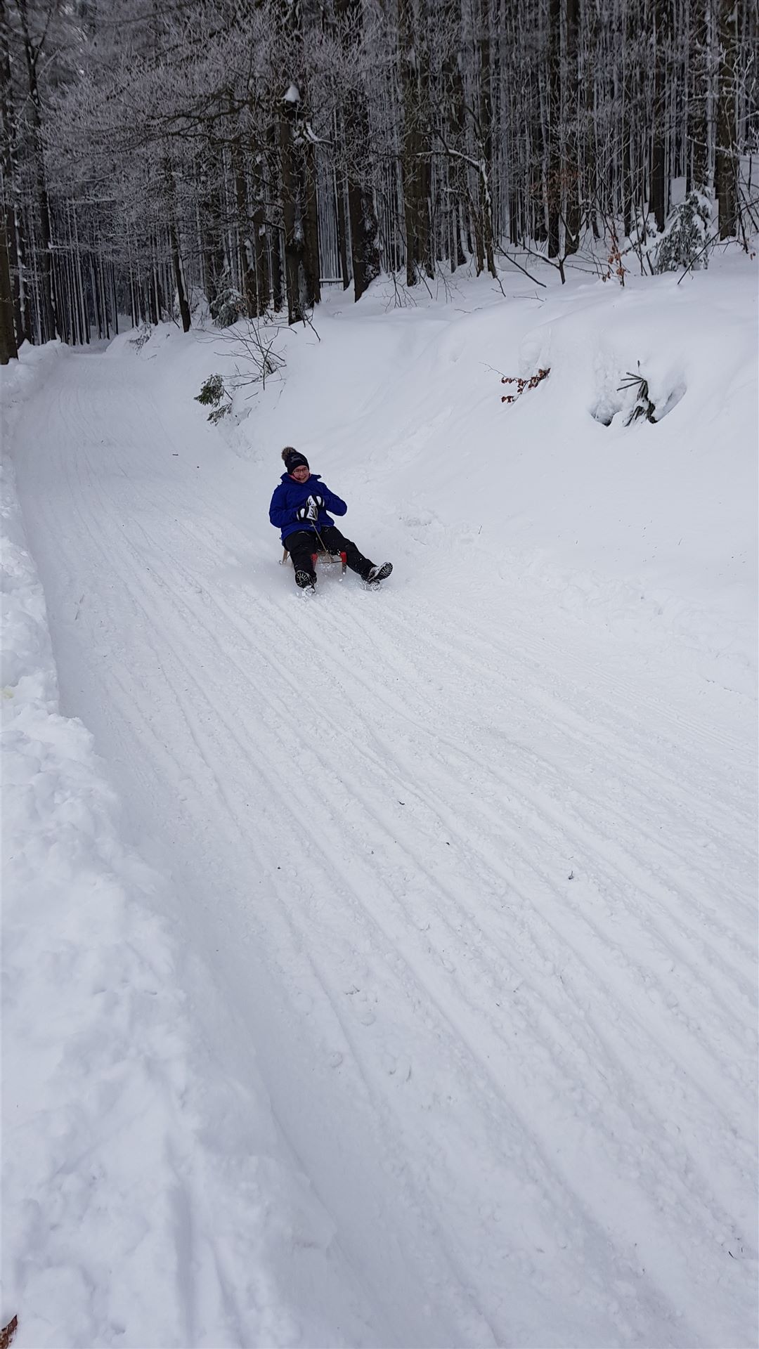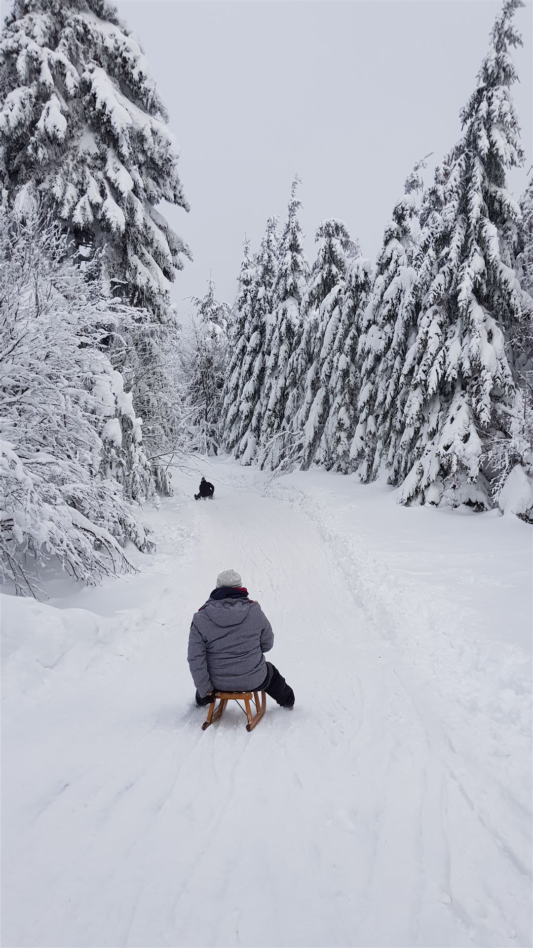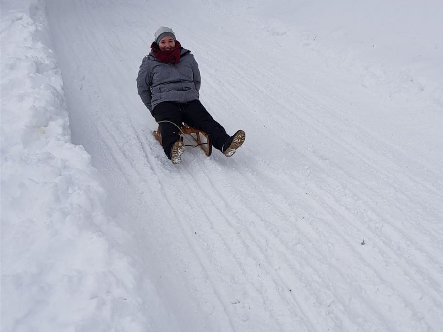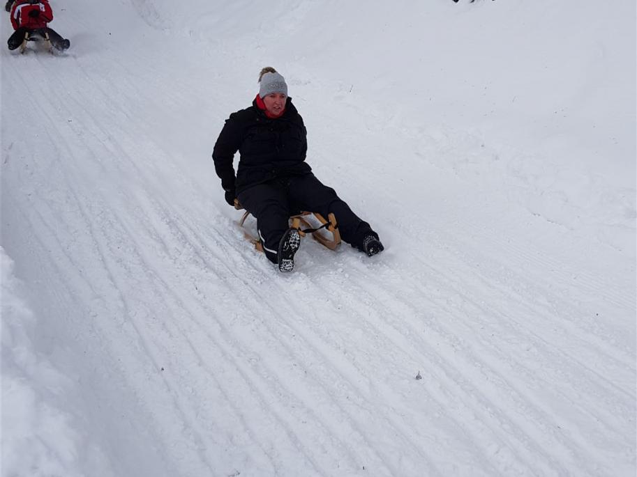 Wir packten unsere Schlitten aus und gingen Richtung Berg, da dort eine tolle Rodelbahn sein sollte.