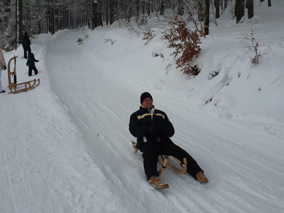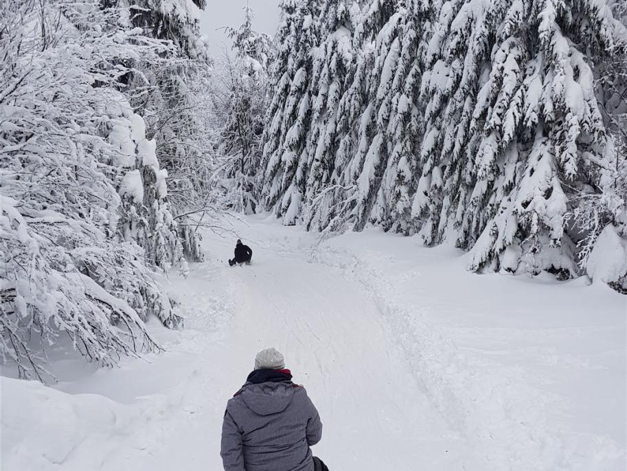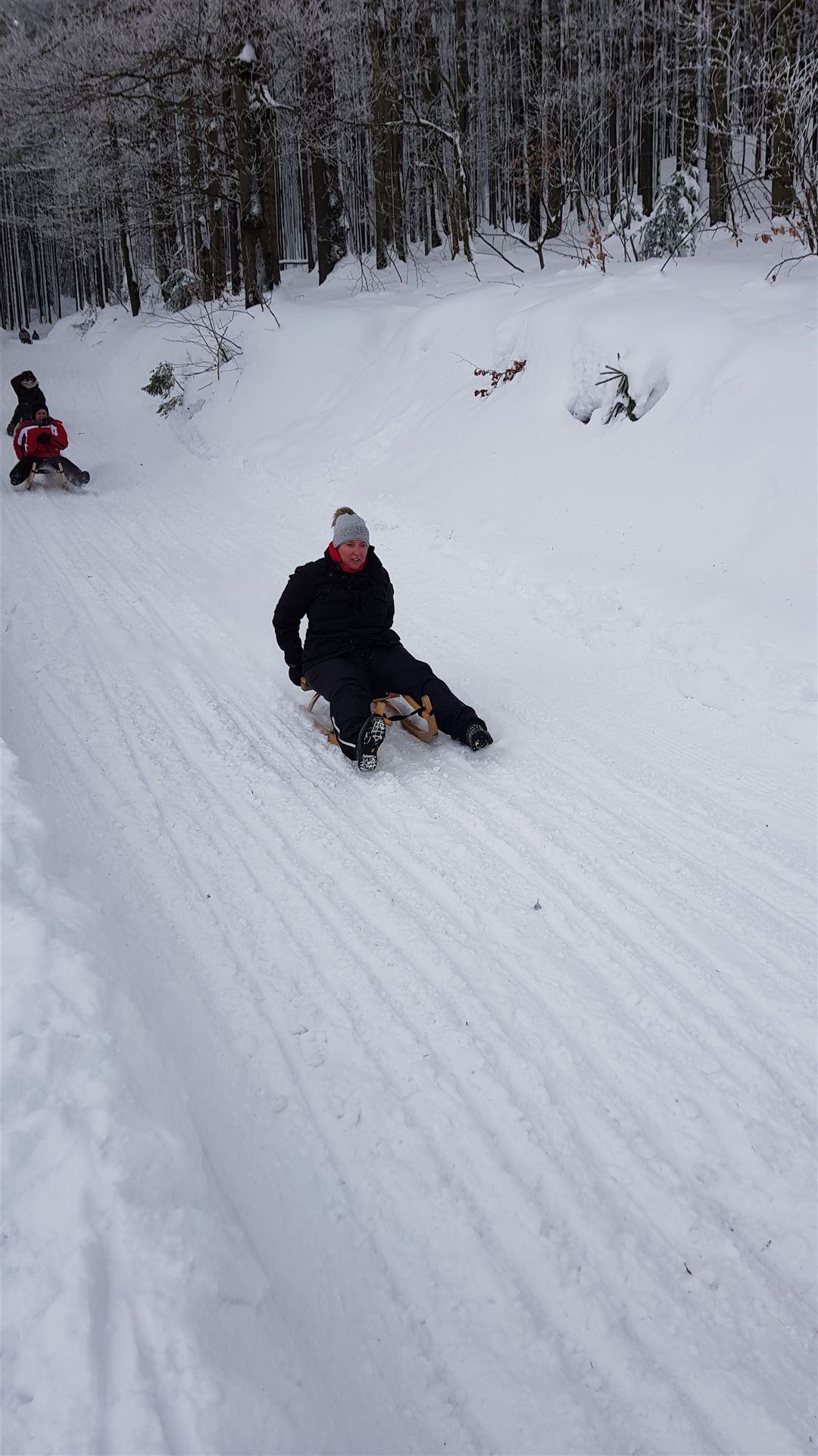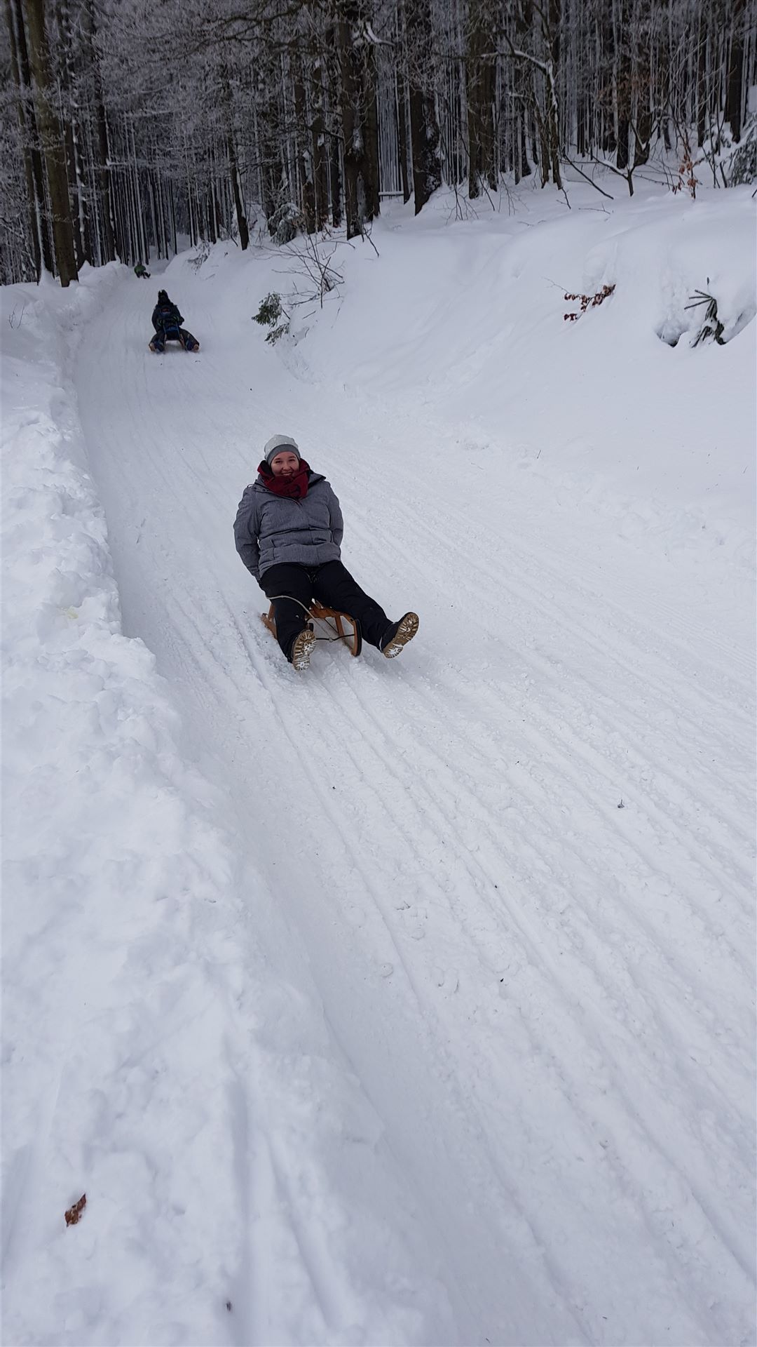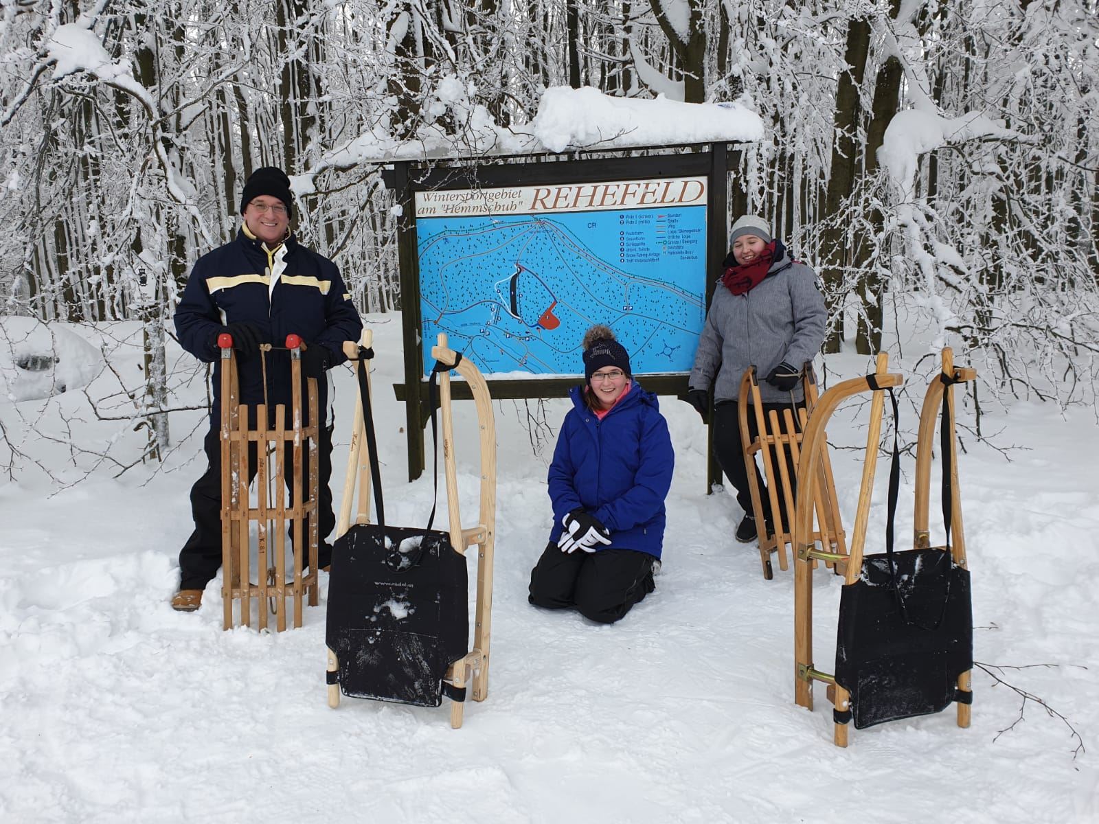 Wir packten unsere Schlitten aus und gingen Richtung Berg, da dort eine tolle Rodelbahn sein sollte.