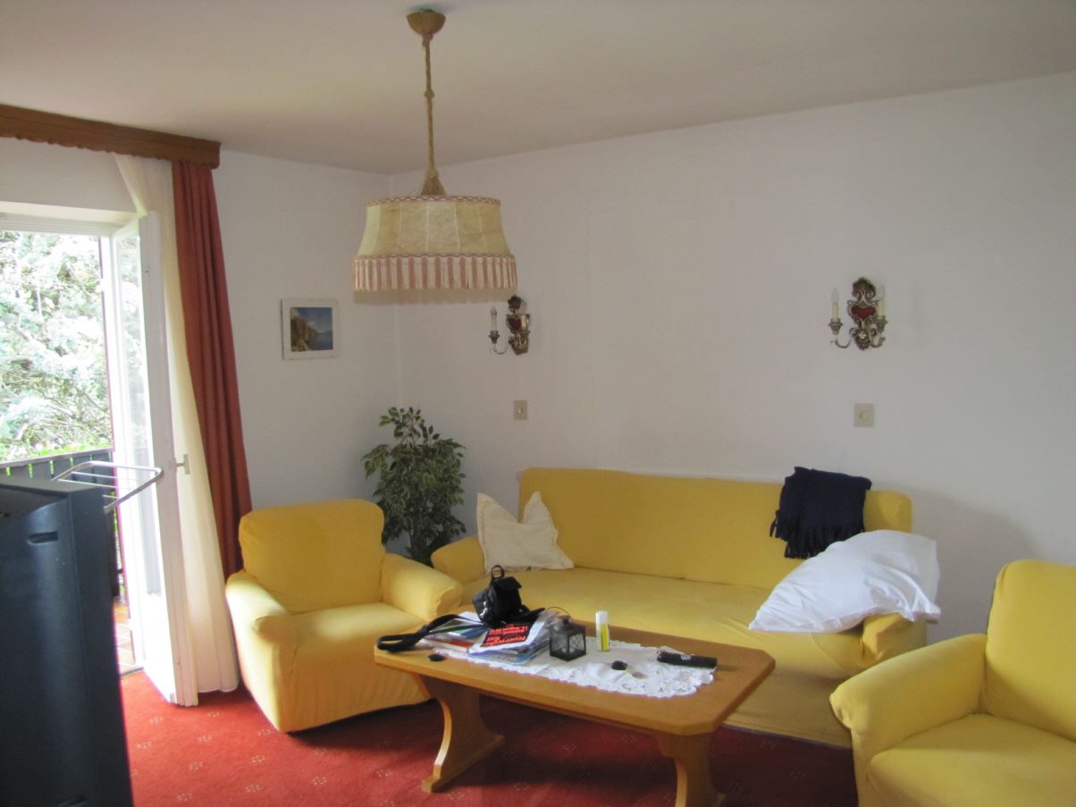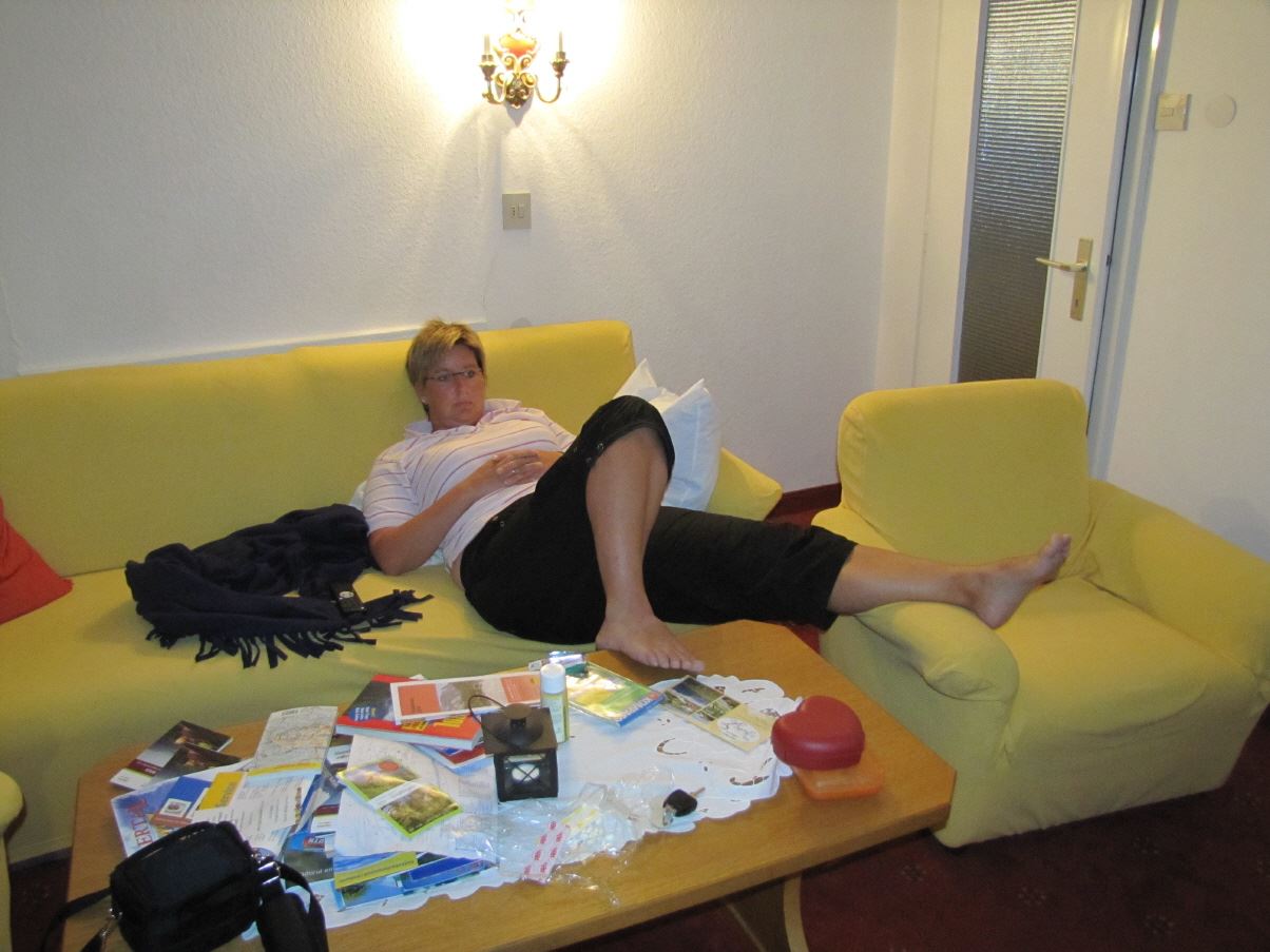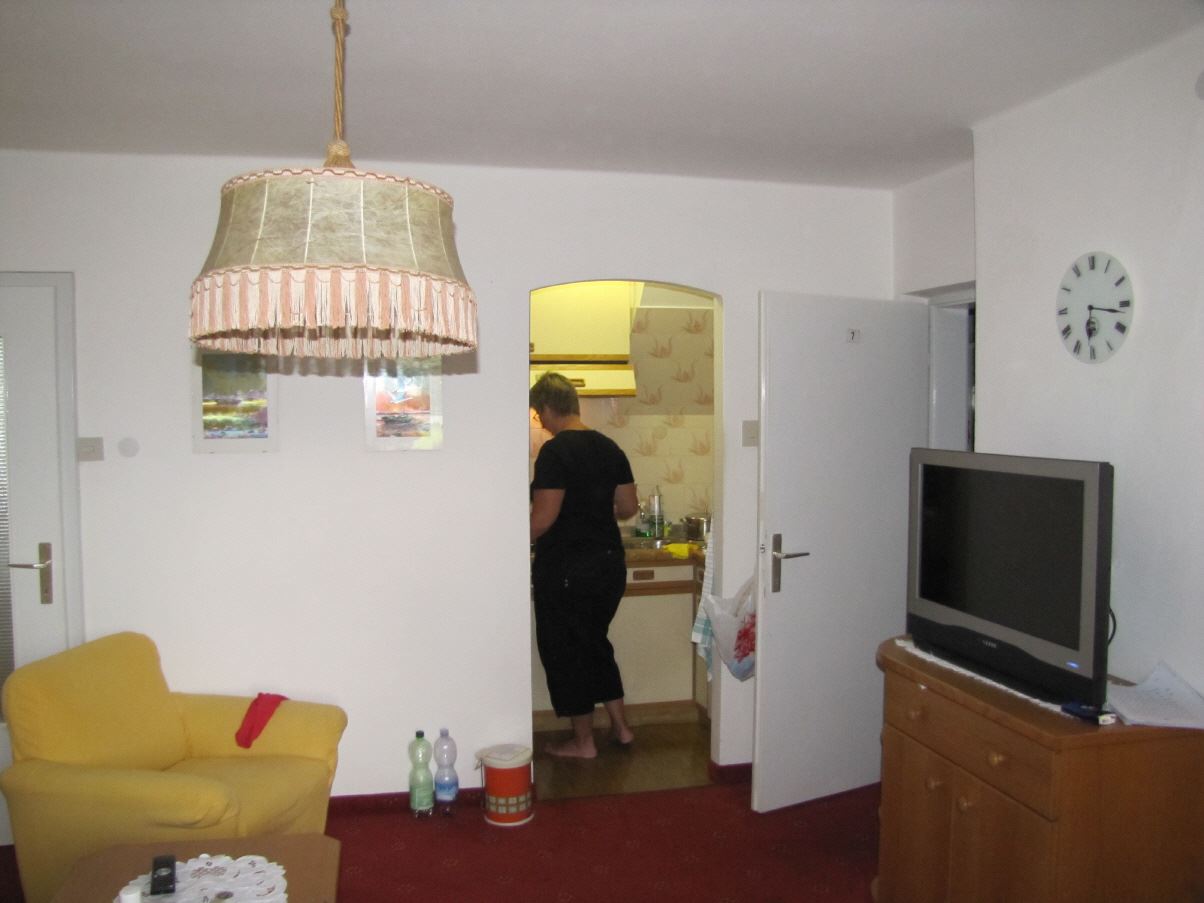 Unser Wohnzimmer, wo man von der Couch hervorragend Fernsehen konnte. Hinten rechts in der Ecke unser drittes Bad mit Dusch.