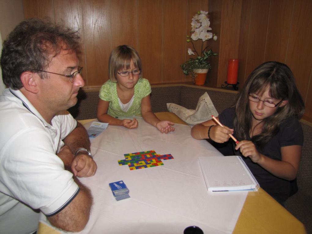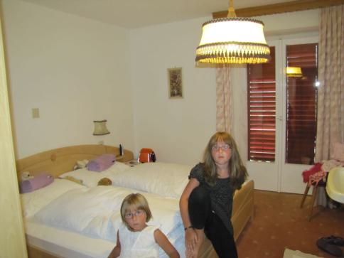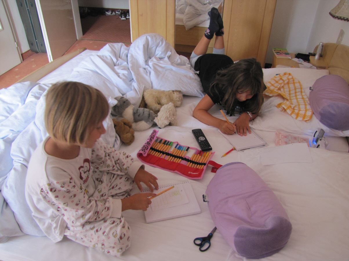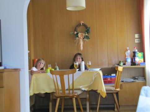 Henrike und Leonie warten schon in der Essecke auf das Abendessen.