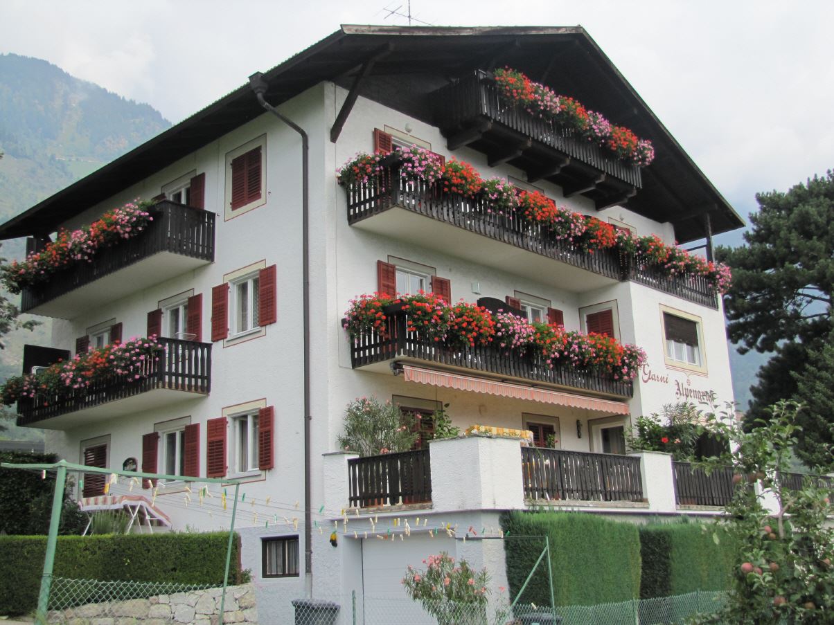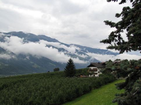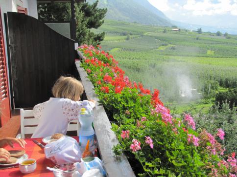 Der Blick von unserem Frühstücksbalkon Richtung Meran.