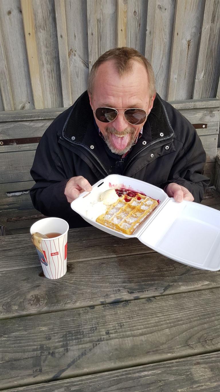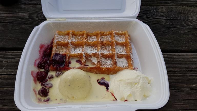 Die Getränke gab es nur per Selbstbedienung, aber das Essen wurde uns geliefert. Bis auf eine Ausnahme gab es für alle Waffeln mit Eis und heißen Kirschen.