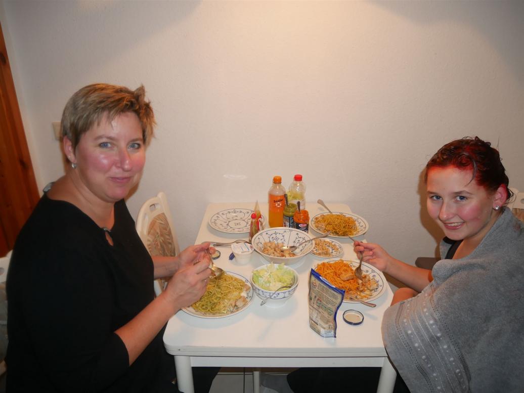 Bis auf Claudia (überbackenes Hähnchenbrustfilet) aßen wir alle Schnitzel.