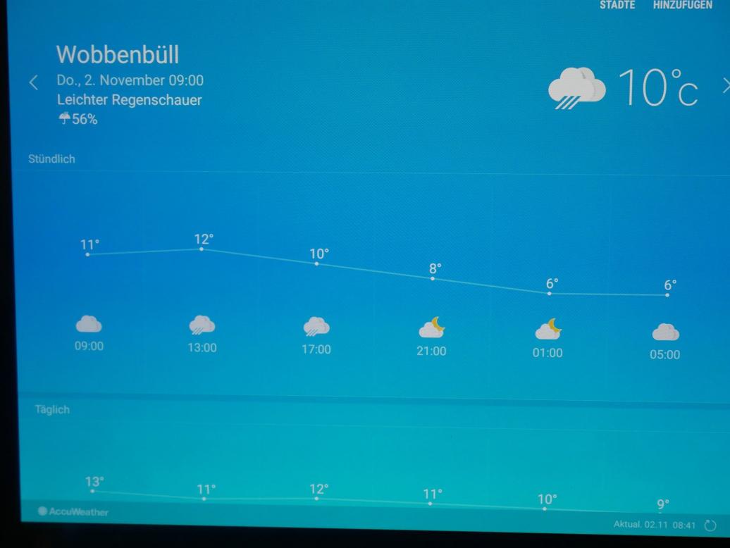Ein Blick auf den elektronischen Wetterbericht besagte auch, dass es draußen regnet.