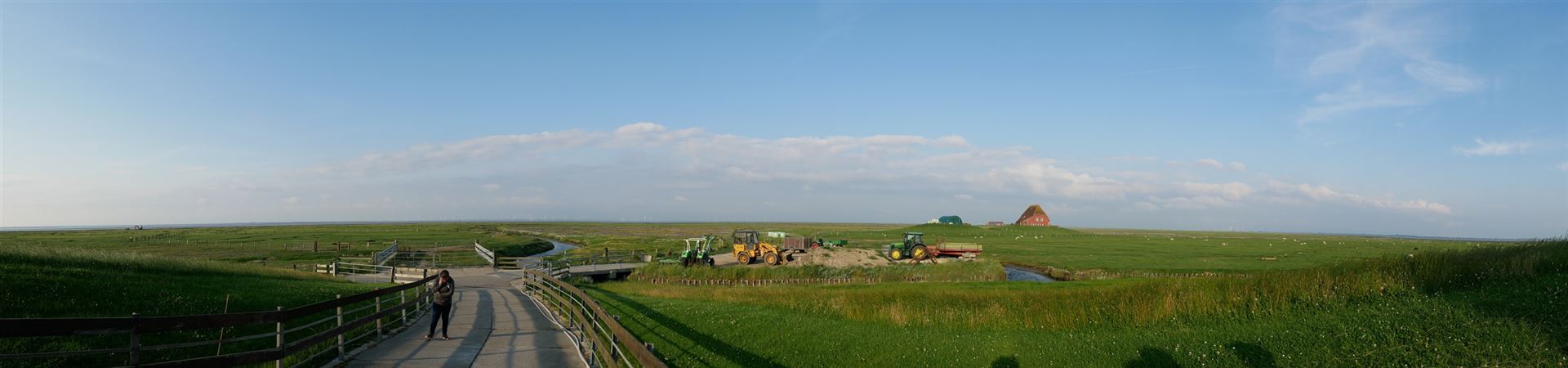 Als wir auf den Deich einbogen offenbarte sich ein großer blauer Himmel und der Wetterbericht im Radio versprach für heute 8 Stunden Sonnenschein auf Nordstrand.
