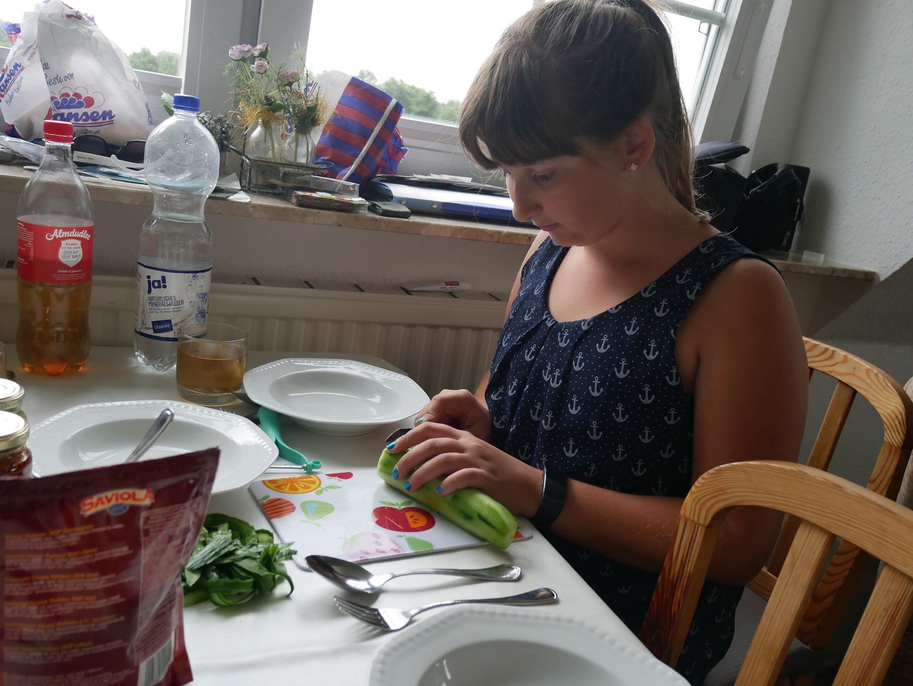 Claudia beschloss nun walken zu gehen und Leonie und Henrike bereiteten das Abendessen vor (Hähnchen schneiden, Salat schnippeln, Gurke schnippeln und das Wasser für den Reis aufsetzen).