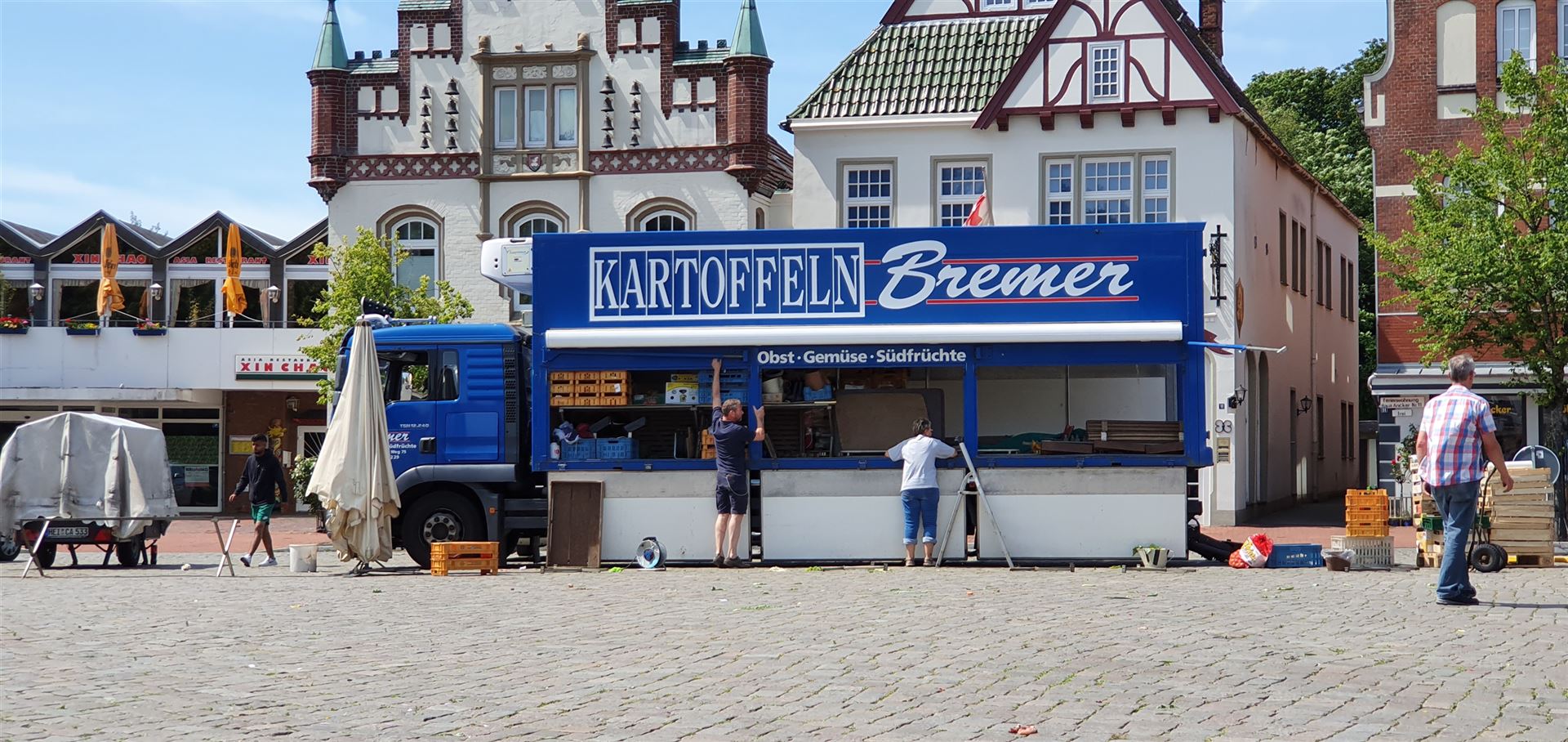 Als wir zum Marktplatz einbogen, sahen wir, dass der Markt in letzten Zügen war, aber Guidos Kartoffellieferant noch da war.