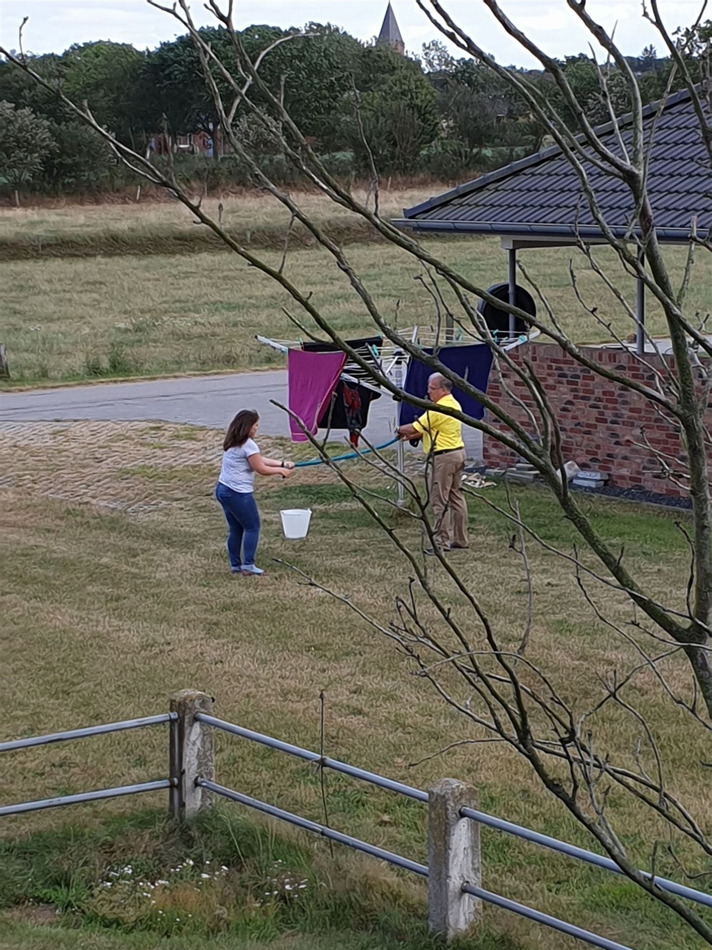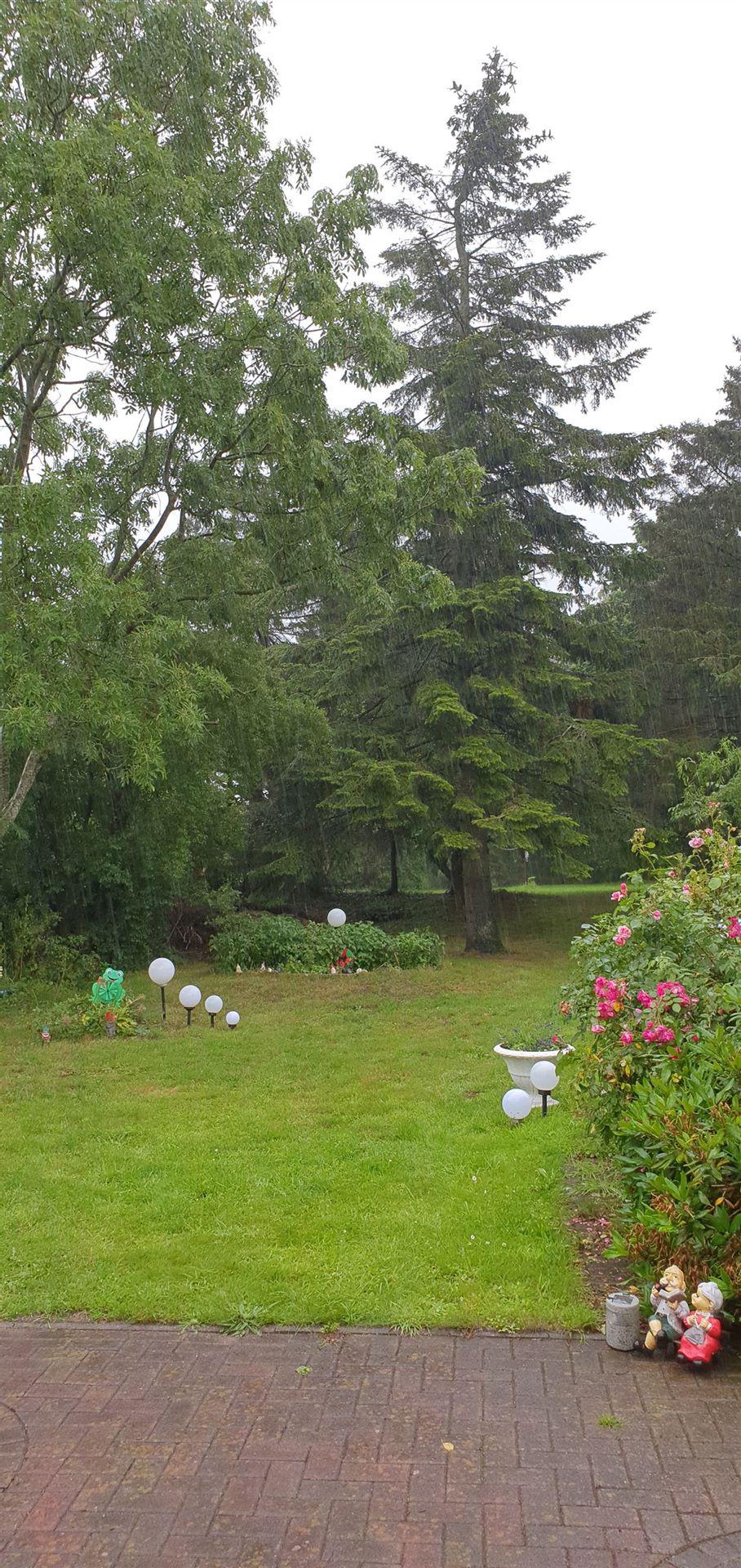 Unterwegs wurde es immer dunkler und als wir in Lunden einbogen, fing es an zu regnen. Aber es waren nicht nur ein paar Tropfen, es war ein richtiger Wasserfall. Als wir bei Galeckis vorfuhren, stand die Einfahrt unter Wasser und wir kamen nur mit nassen Füßen ins Haus hinein.
