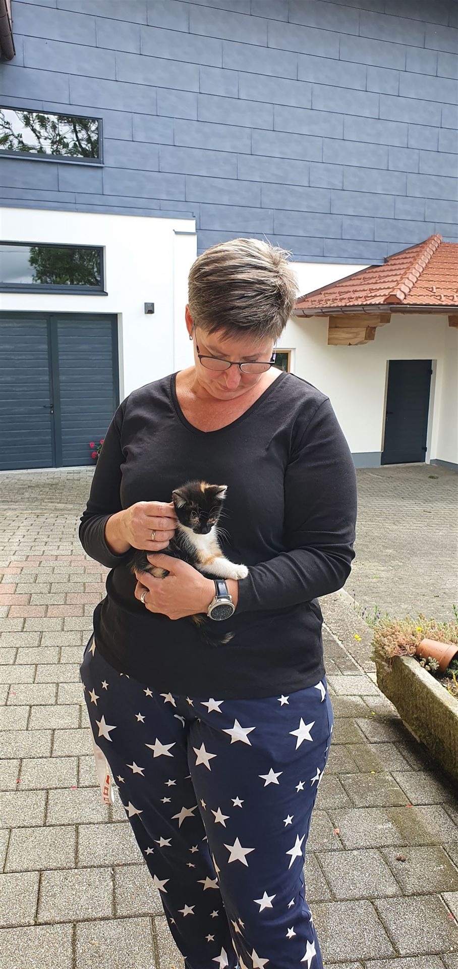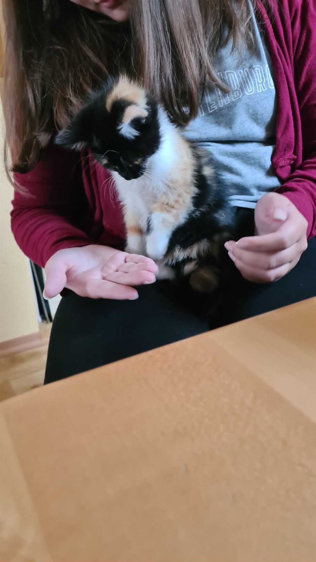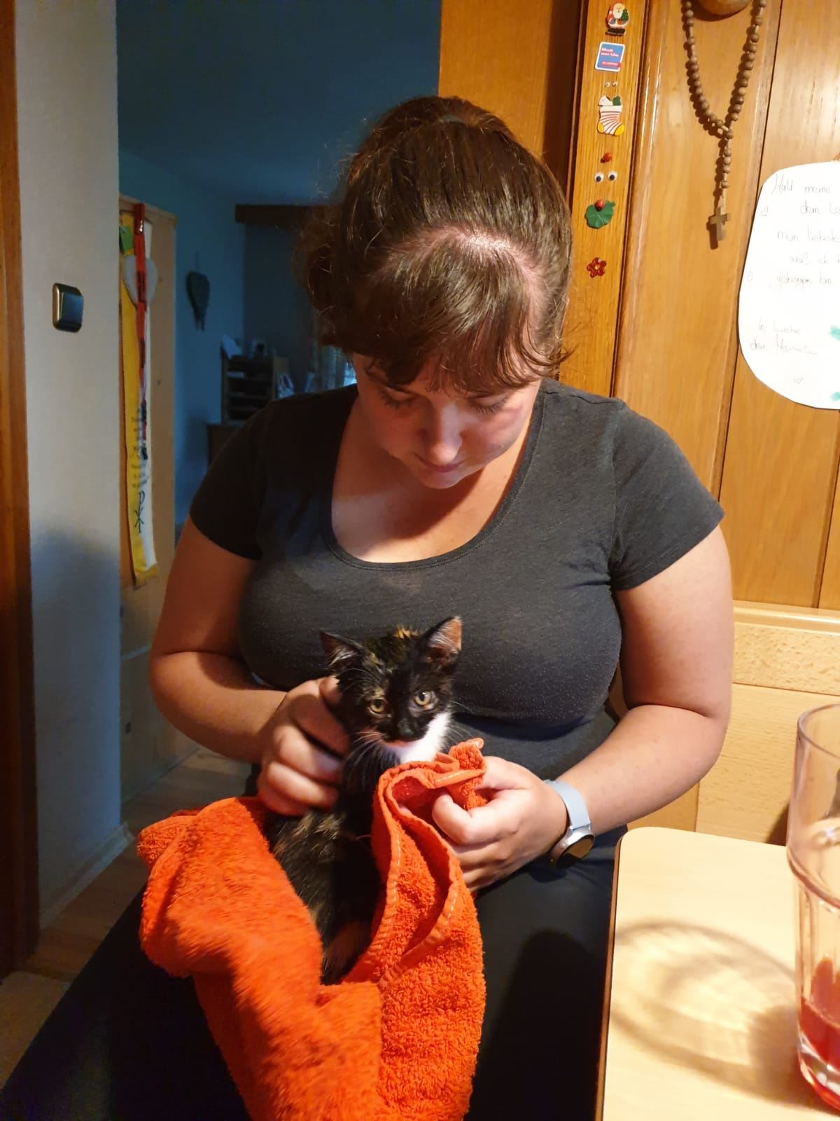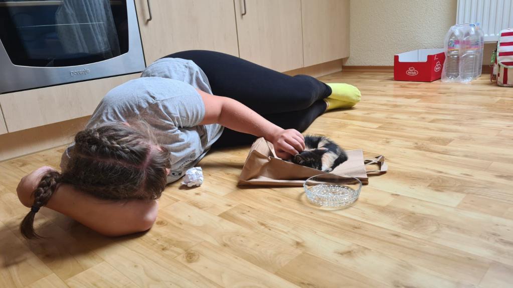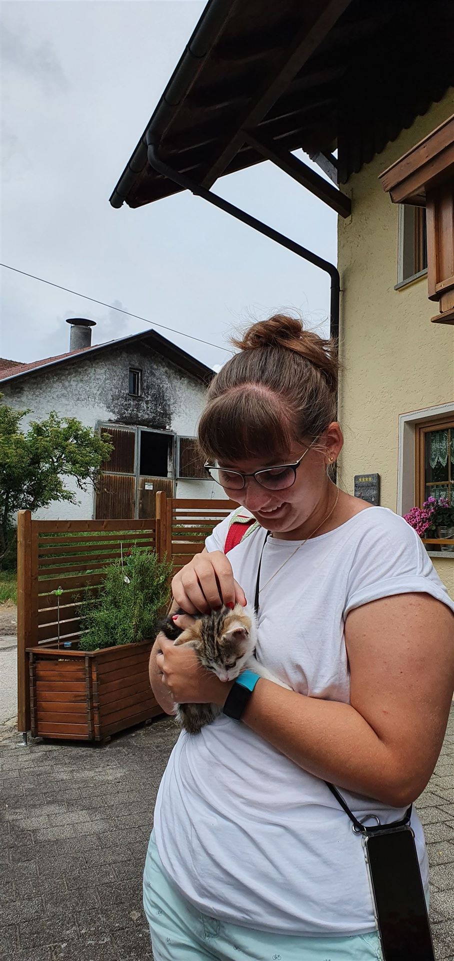 Leonie schaute unten auch mal kurz vorbei, ob die beiden noch lebten. Dabei kuschelte sie mit der letzten kleinen Katze.