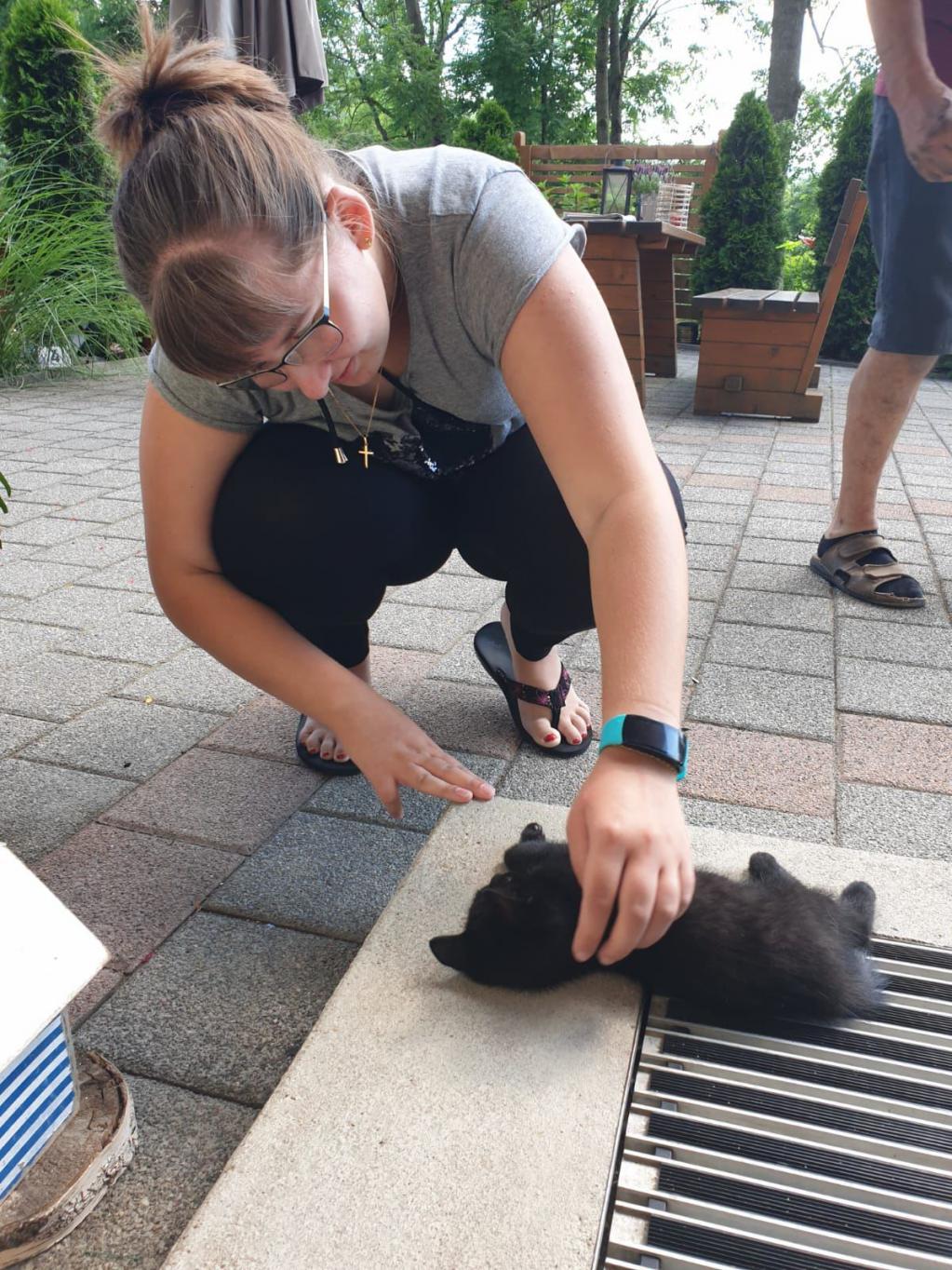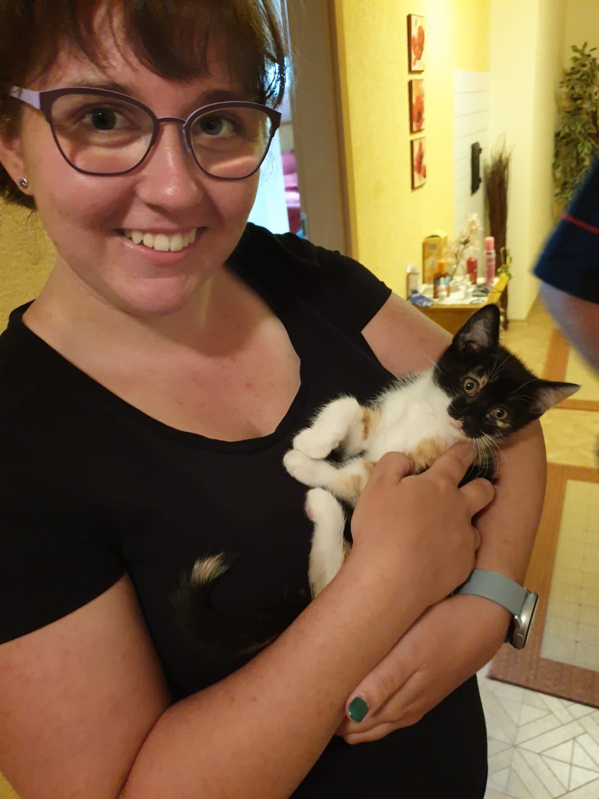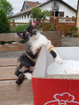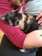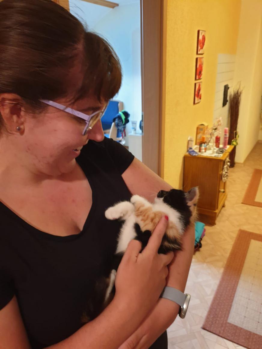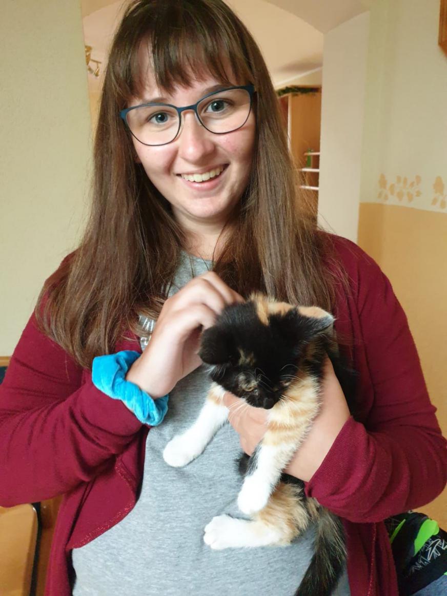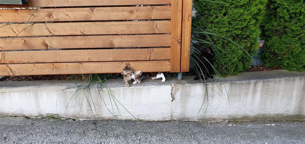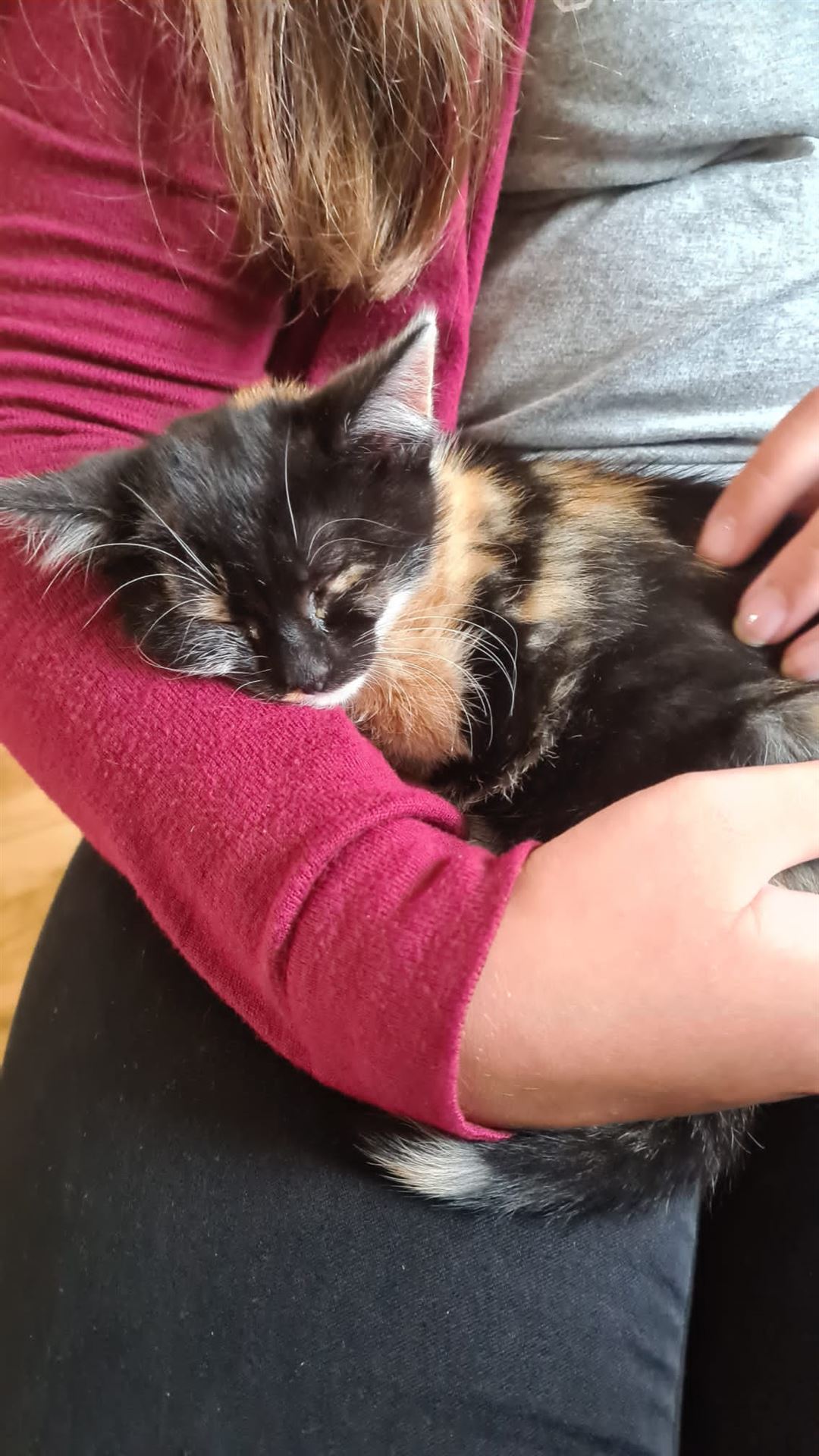 Leonie schaute unten auch mal kurz vorbei, ob die beiden noch lebten. Dabei kuschelte sie mit der letzten kleinen Katze.