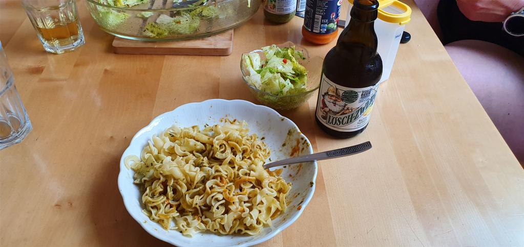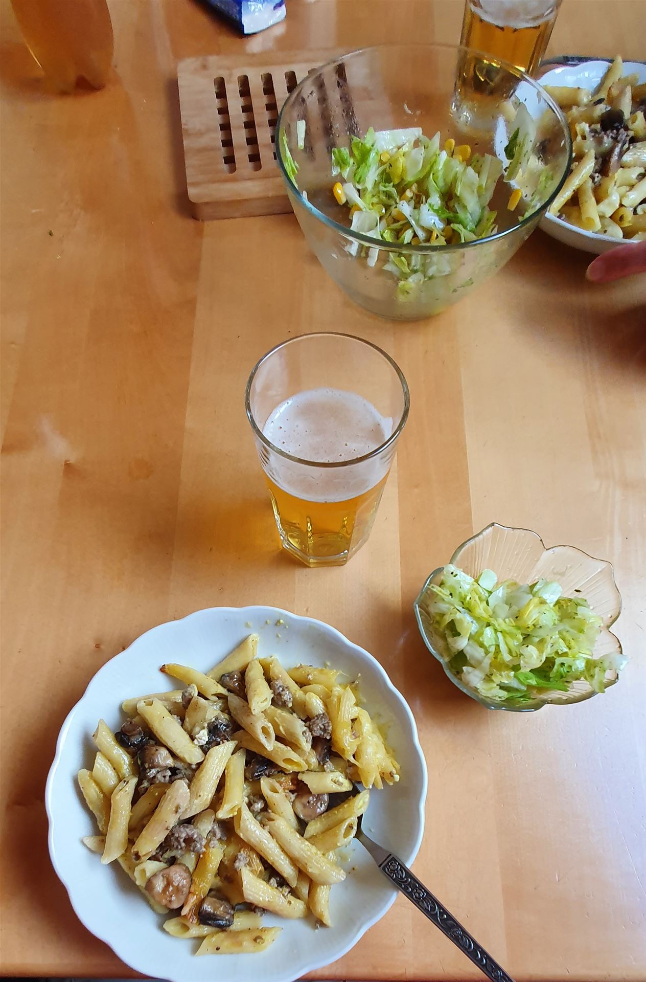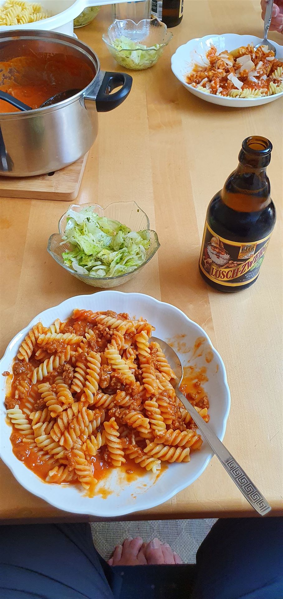 Zu Abend gab es Nudeln mit Tomatensoße und Salat.