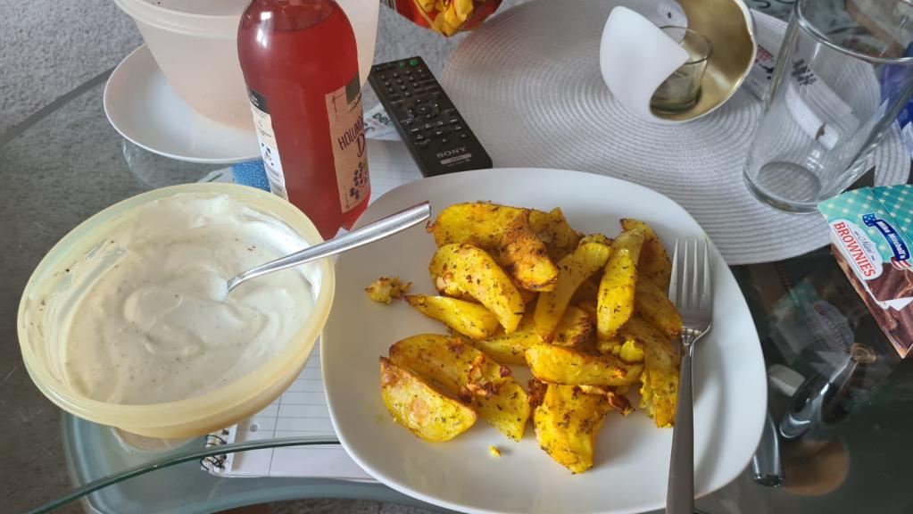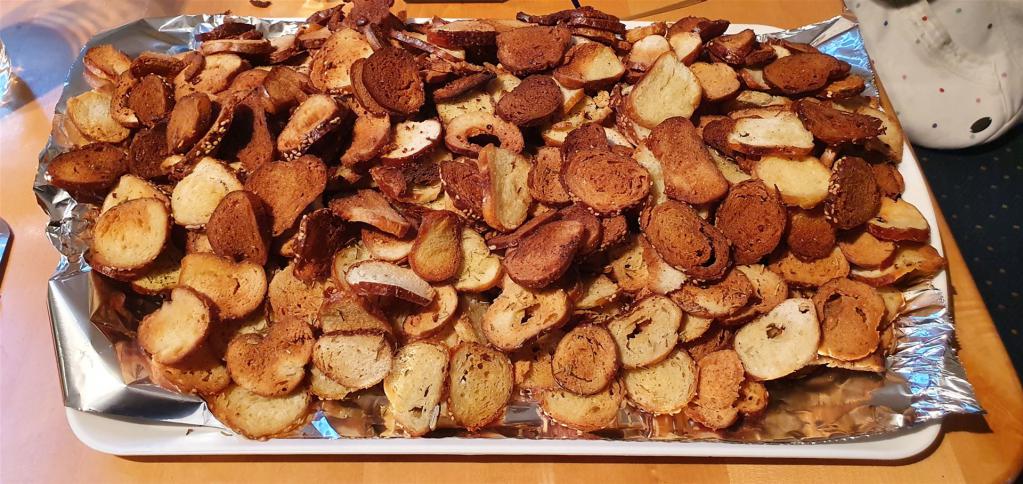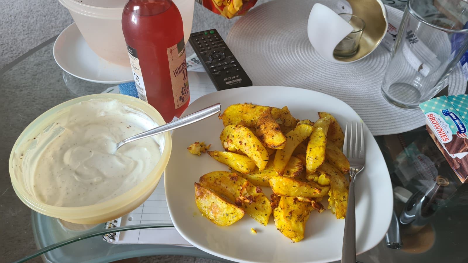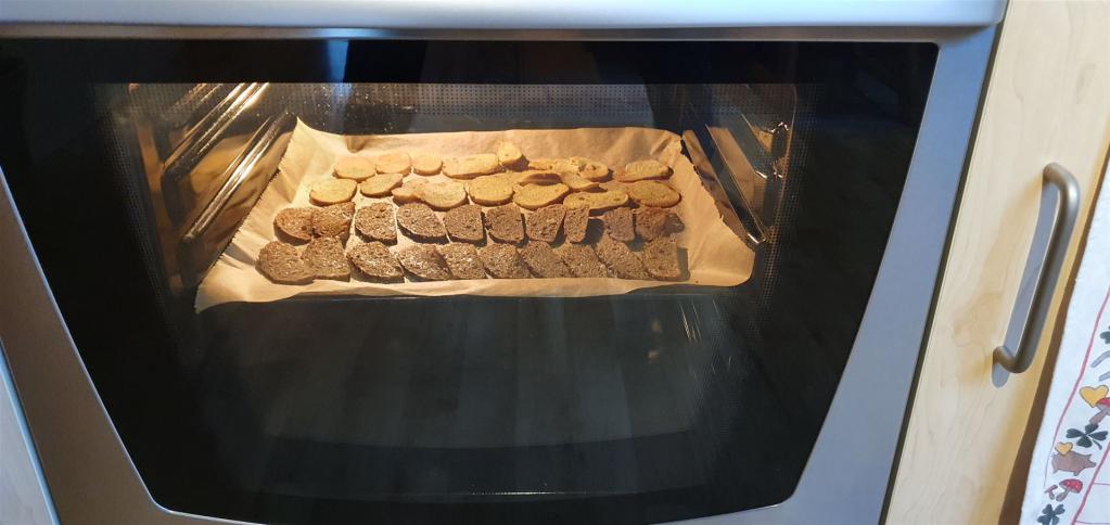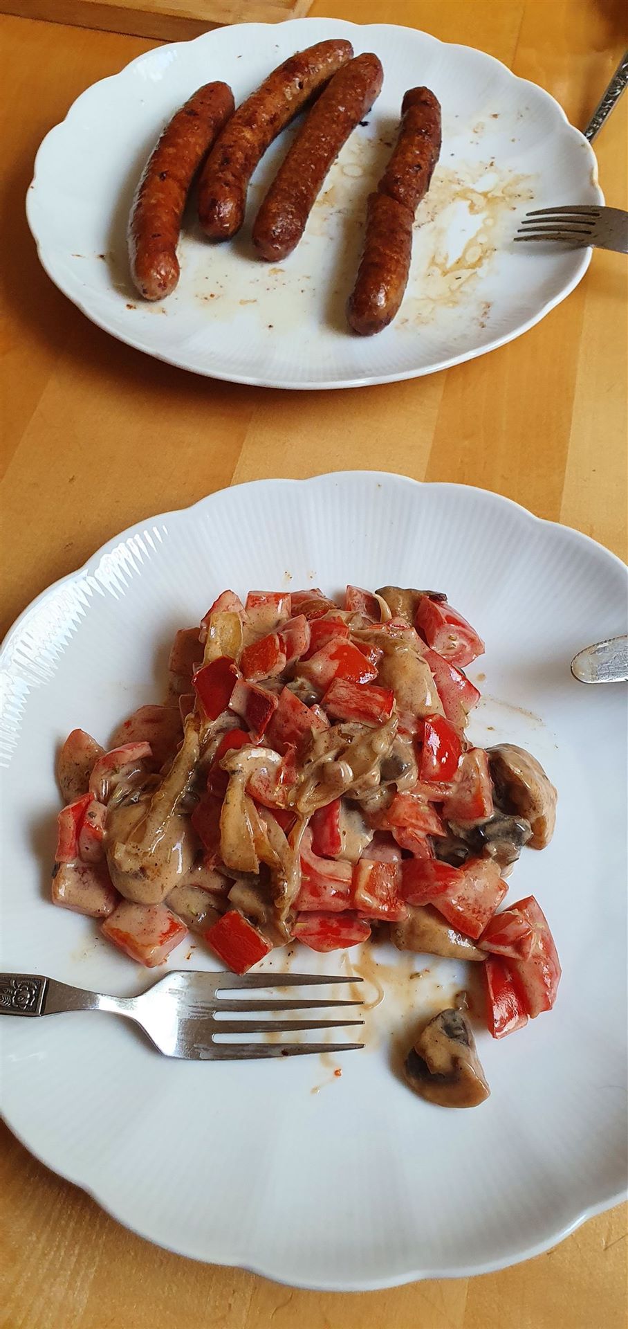 Anschließend wurden Kartoffeln geschält und auf Blechen in den Ofen geschoben. Dazu gab es frische Bratwürste (Nürnberger, Knoblauchwürste und Bärlauchwürste), Paprika und Champignons.