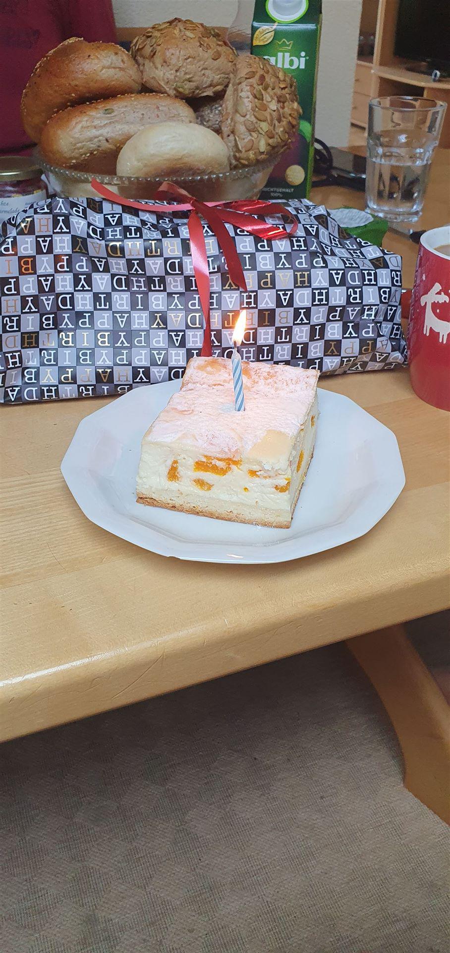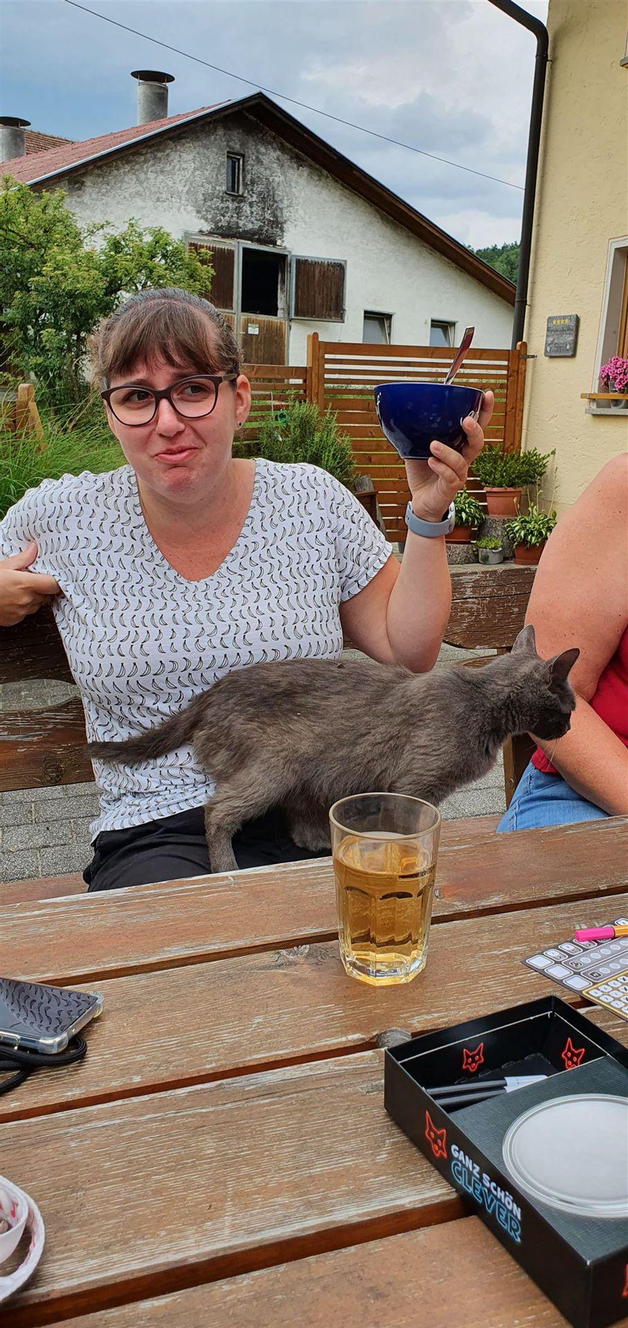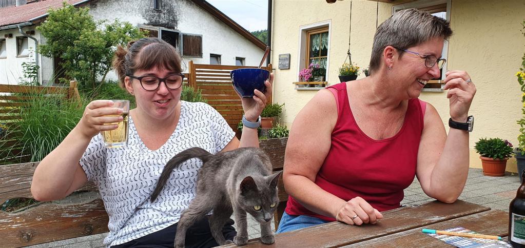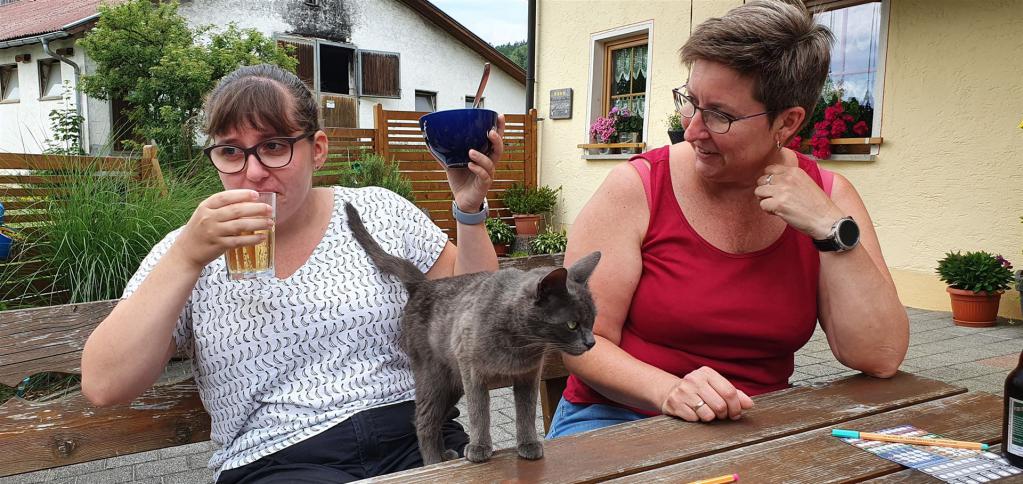 Da sich die kleine Katze bei dem Wetter (es donnerte auch immer wieder) draußen fürchtete, nahm Rieke sie zu uns mit nach oben. So hatte Claudia zum Geburtstagskaffee noch Besuch.