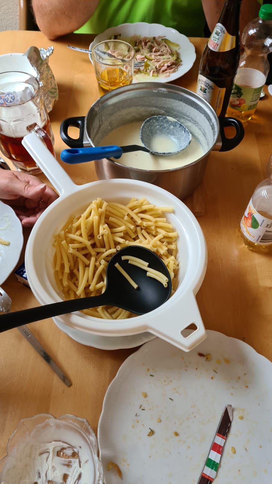 Nudeln, Kartoffeln, Mais, Salat, Erbsen, Brot, Leberkäse, Fisch, Bier