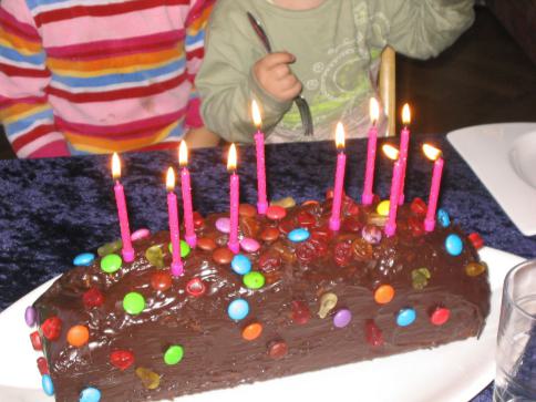 Mama brachte uns einen leckeren Kuchen mit Gummibärchen und Smarties. |