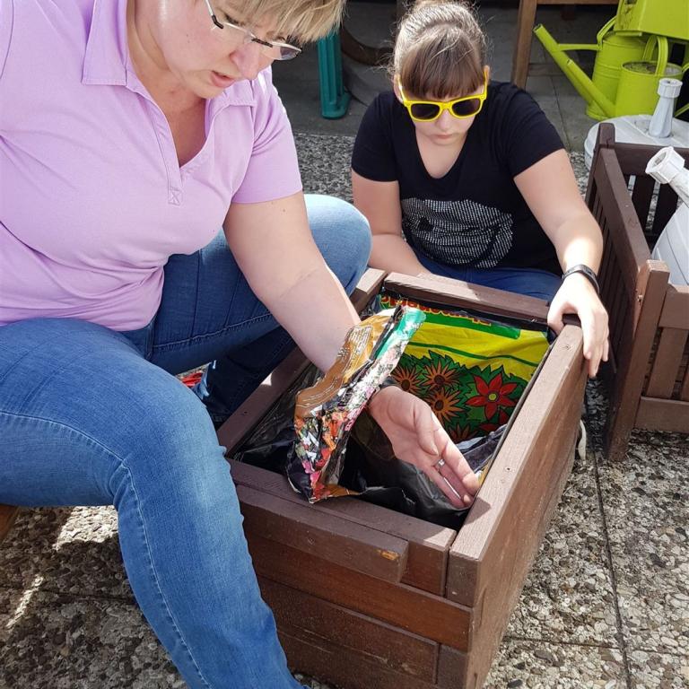 Nun mussten noch die Blumenkübel mit Folie ausgelegt und mit Erde gefüllt werden.