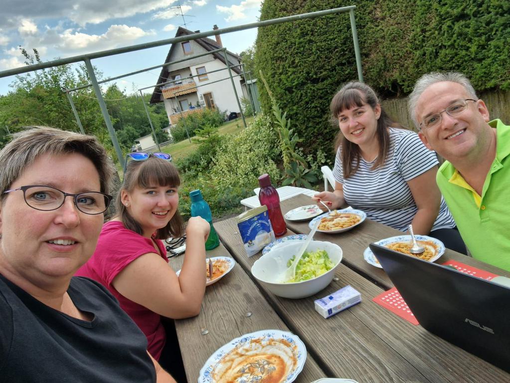 Vor dem Abendessen telefonierten wir noch mit Leonie und aßen dann die restlichen vorhandenen Nudeln mit Eiern überbraten und Knacker dazu.