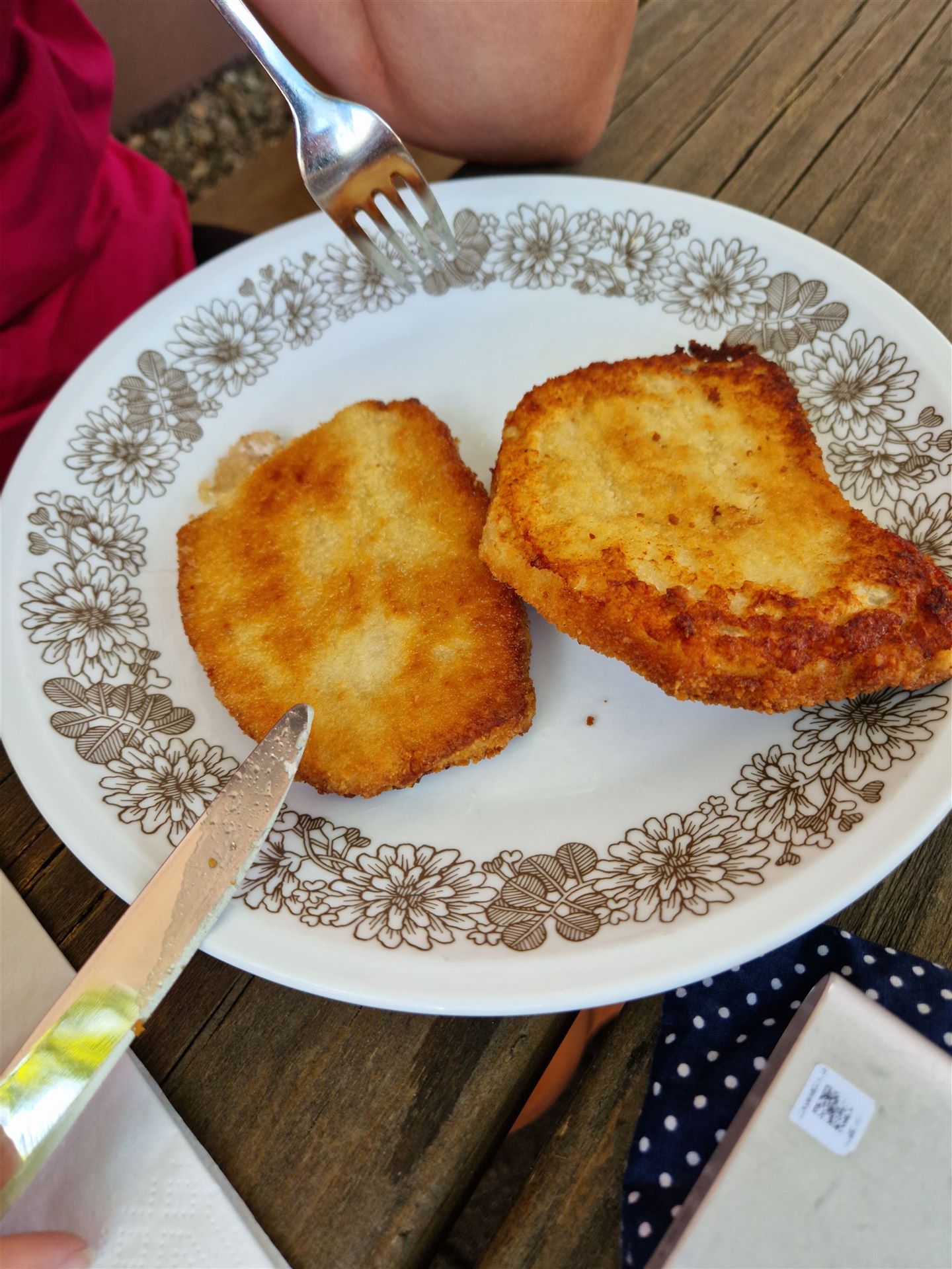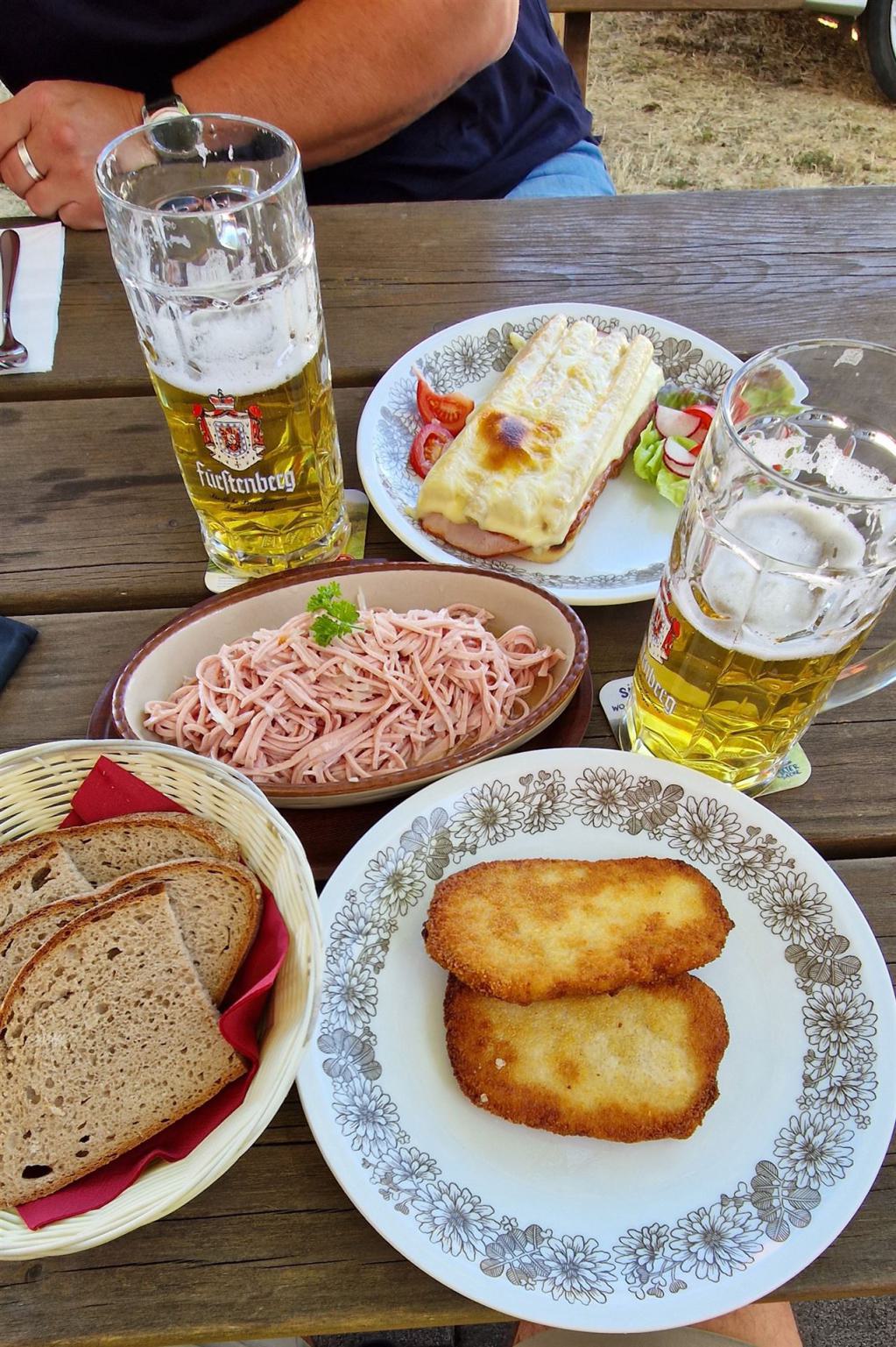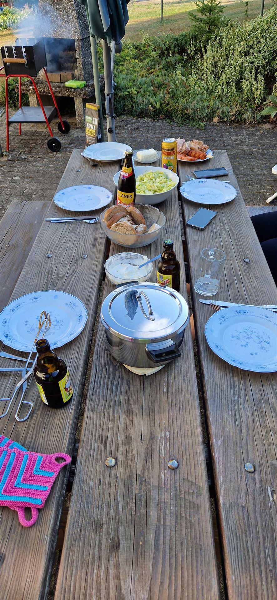 Brötchen und Buletten von der Hinfahrt, ergänzt mit Kartoffel – und Nudelsalat.
